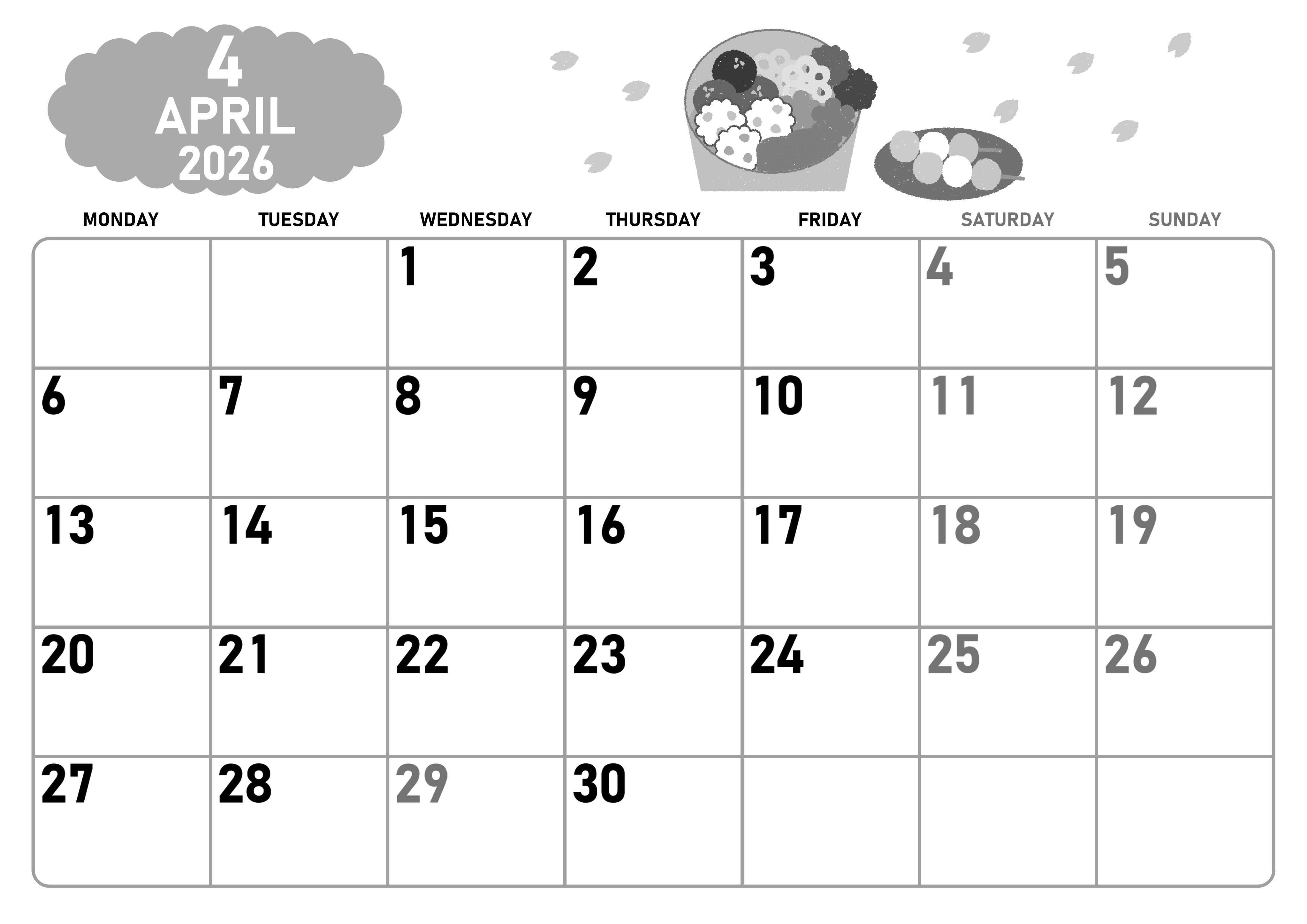 2026年4月横型モノクロの月曜始まりの無料テンプレート白黒カレンダーです。お花見をしたくなるようなかわいいイラスト白黒カレンダーです。月曜始まりが使いやすいという人におすすめしたいフリー素材です。(2026-00420401)