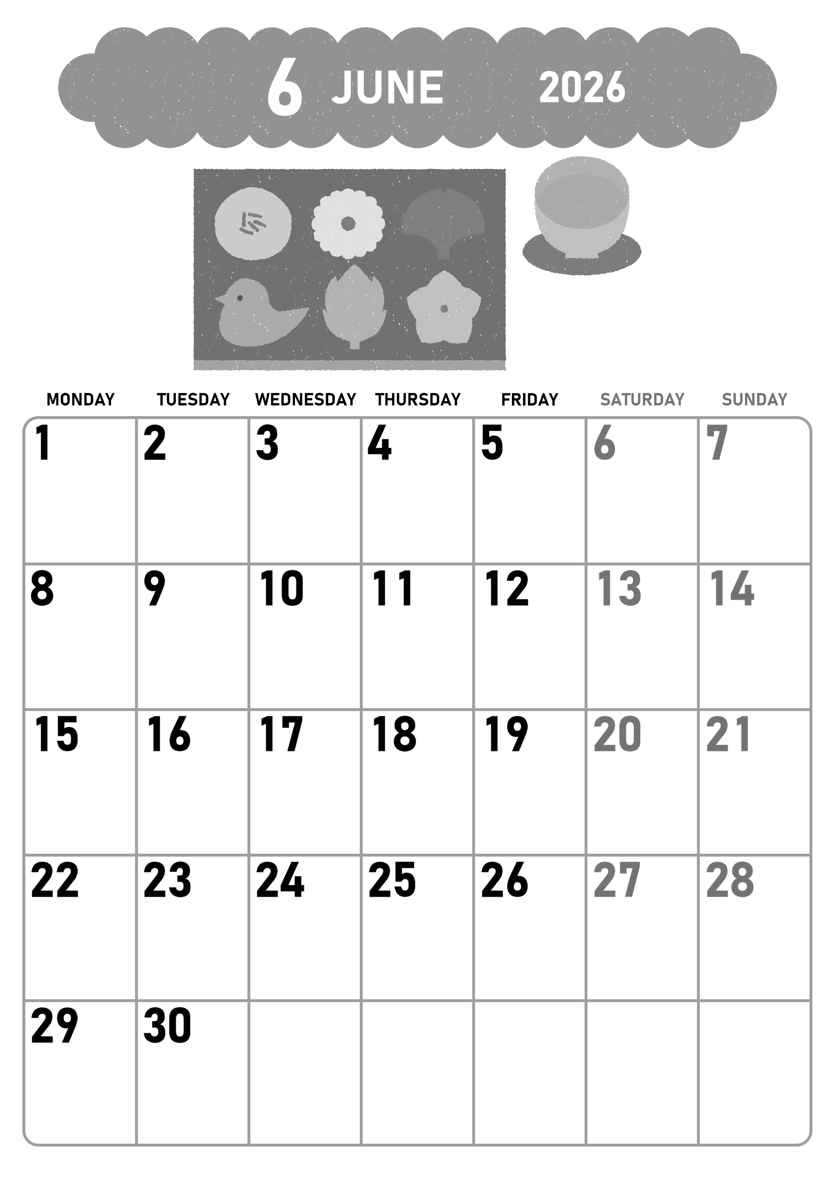 2026年6月縦型モノクロの月曜始まりの無料テンプレート白黒カレンダーです。月曜始まり白黒カレンダーに馴染みがあるという人におすすめしたい和菓子イラストがポイントになっているかわいいフォーマットの素材です。(2026-00420611)