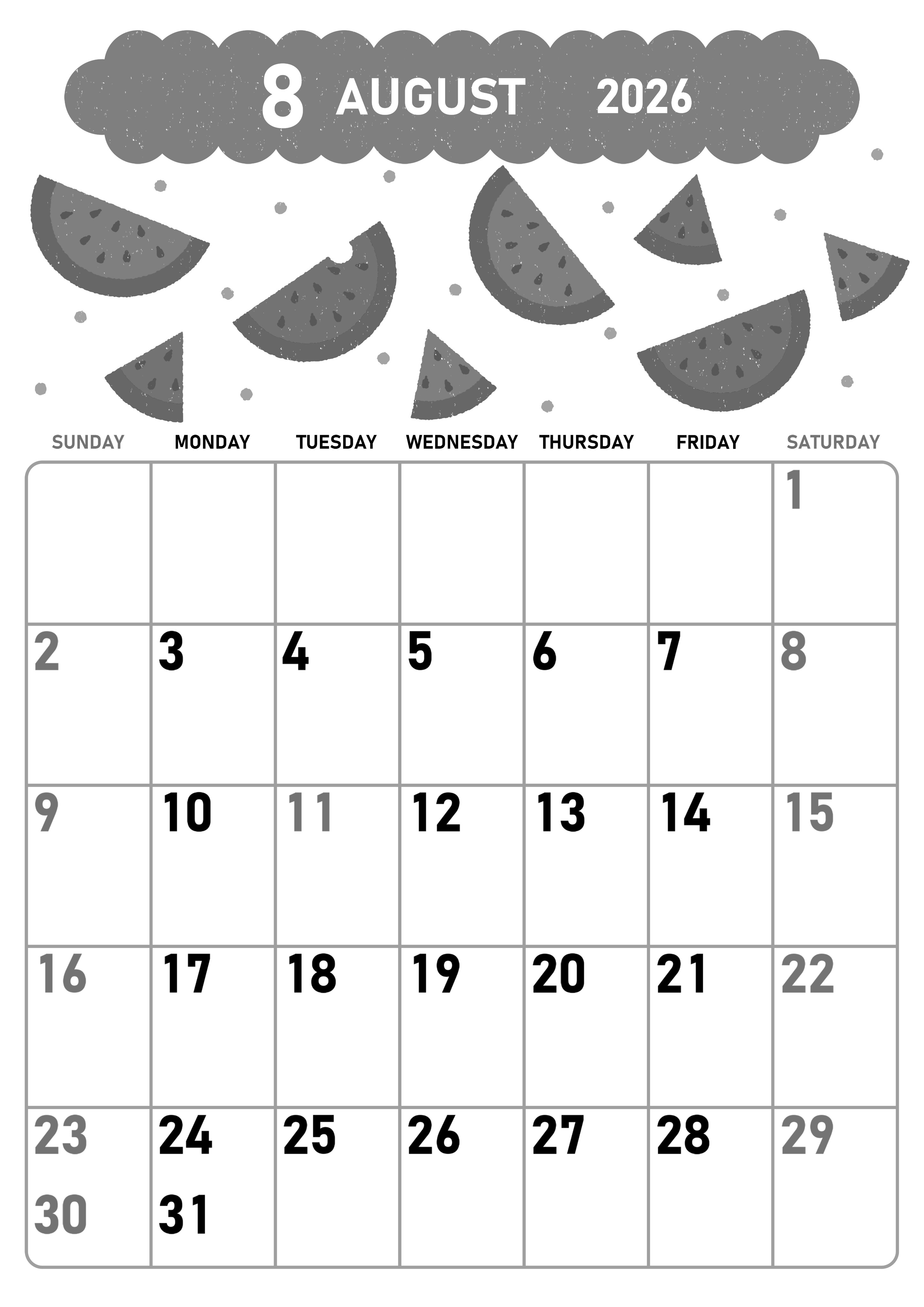 2026年8月縦型モノクロの日曜始まりの無料テンプレート白黒カレンダーです。夏の季節の果物といえばスイカです。そのスイカを描き上げたかわいいイラストが魅力的です。白黒カレンダー部分も使いやすいフォーマットです。(2026-00420810)
