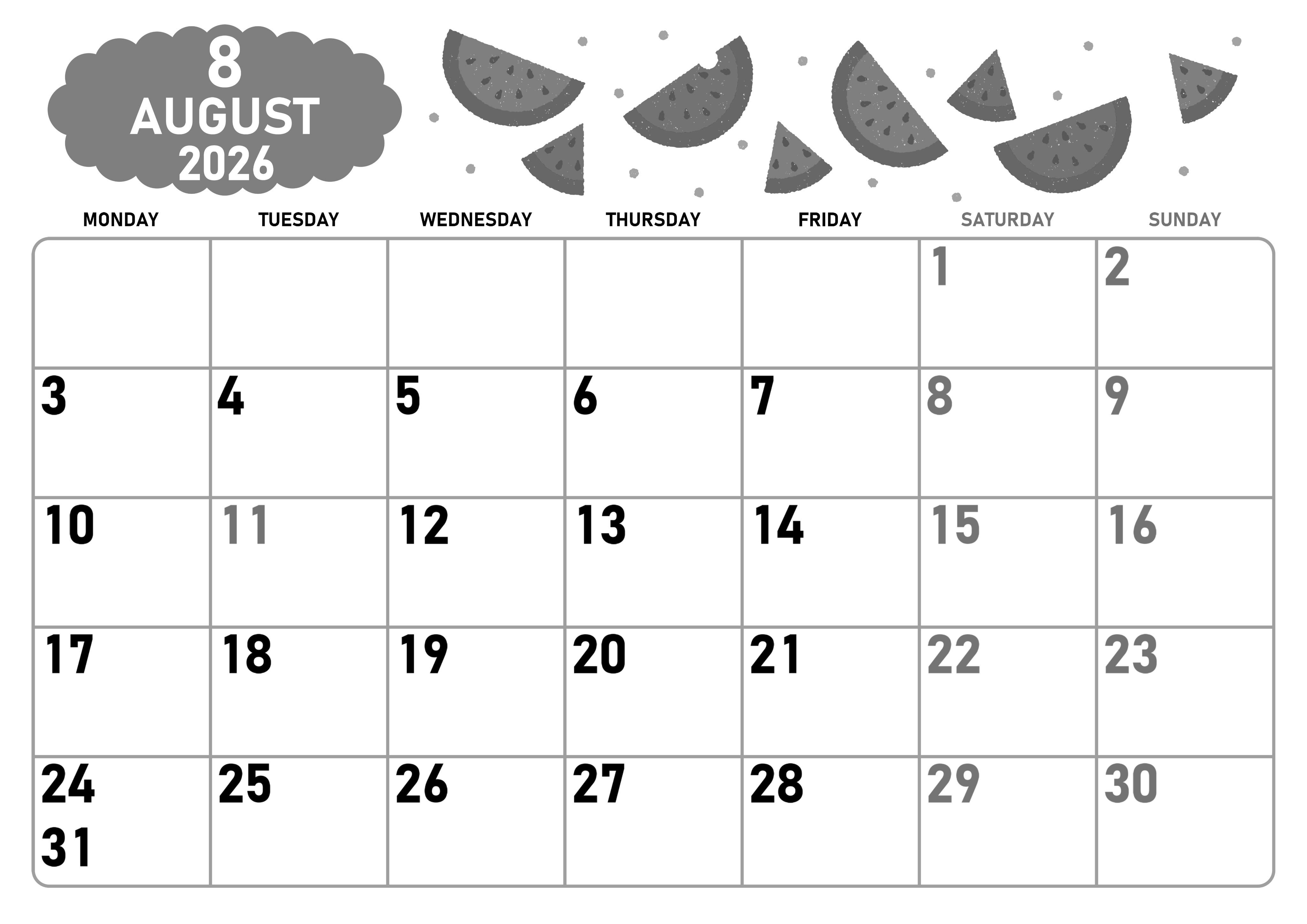 2026年8月横型モノクロの月曜始まりの無料テンプレート白黒カレンダーです。夏の季節の果物といえばスイカです。かわいいイラストの中に一口かじられたスイカがいるので探してみて下さい。月曜始まりでA4サイズの白黒カレンダーです。(2026-00420801)