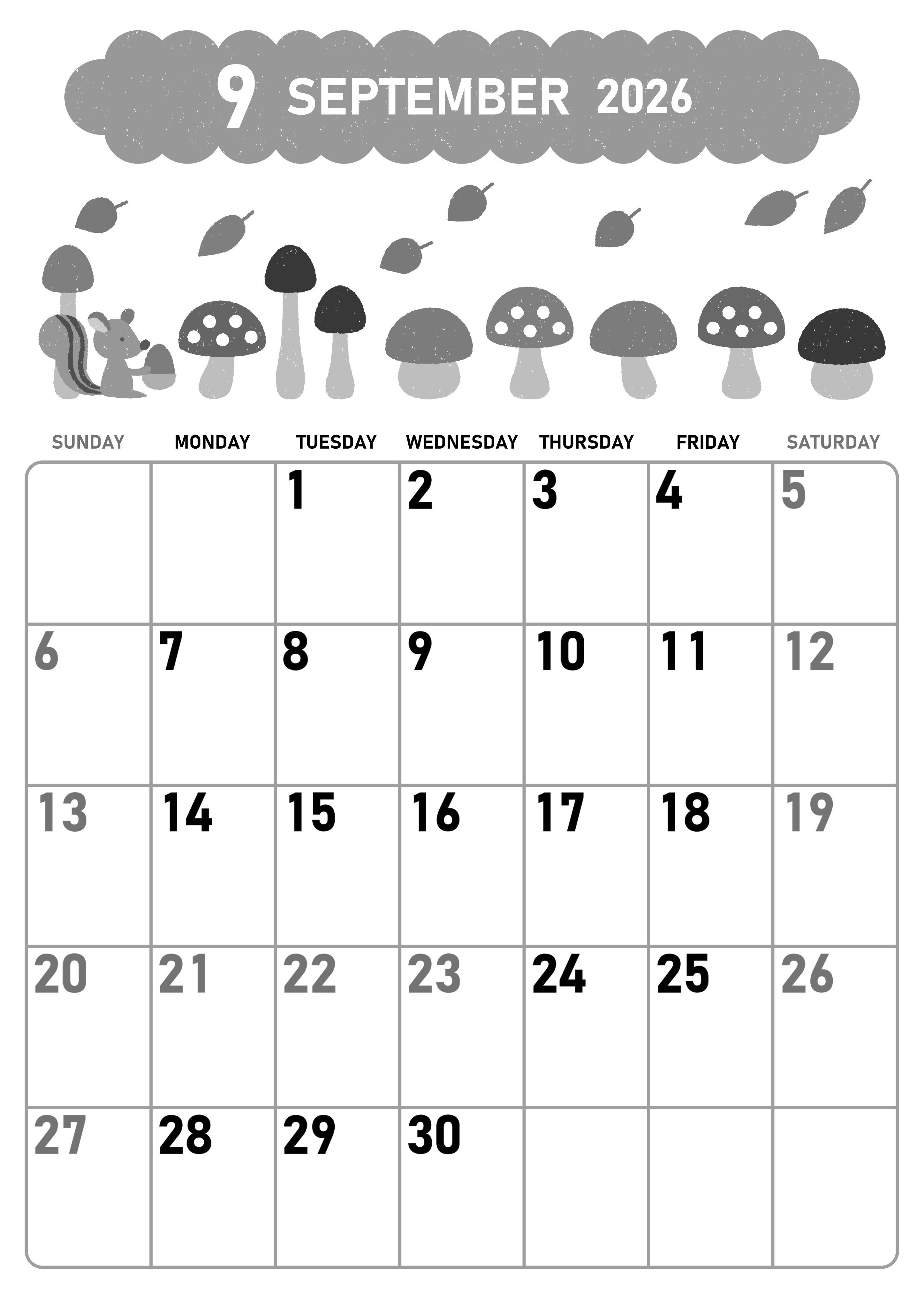 2026年9月縦型モノクロの日曜始まりの無料テンプレート白黒カレンダーです。いろいろなタイプのキノコがたくさん並んでるところに紅葉が漂っている様子が描かれているイラストは秋の季節を感じさせるかわいい雰囲気になっています。(2026-00420910)