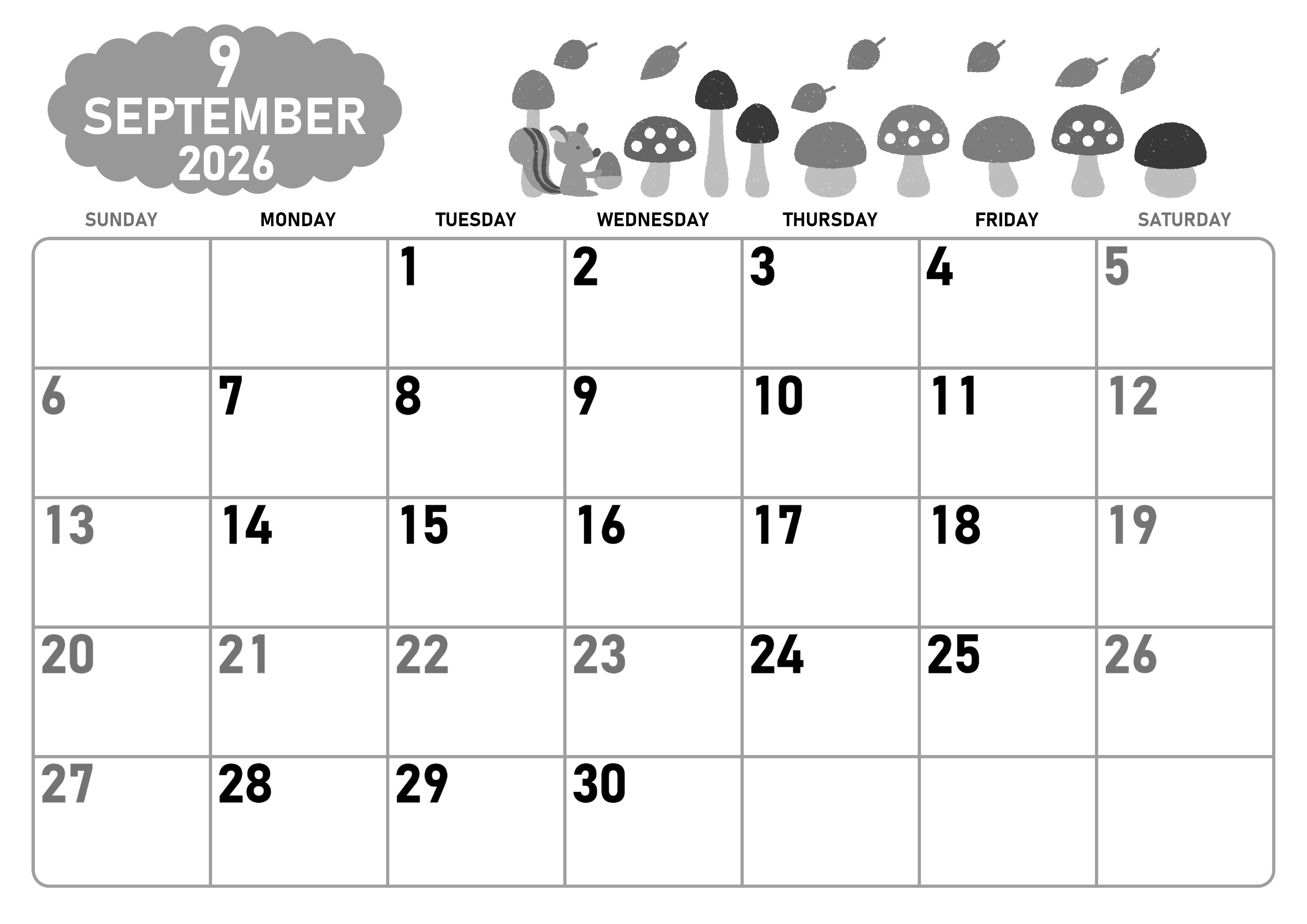 2026年9月横型モノクロの日曜始まりの無料テンプレート白黒カレンダーです。にょきにょきと生命力力強く天高く生えているたくさんのキノコが並んでいるイラストから秋の季節を感じさせられるかわいいイラストです。(2026-00420900)
