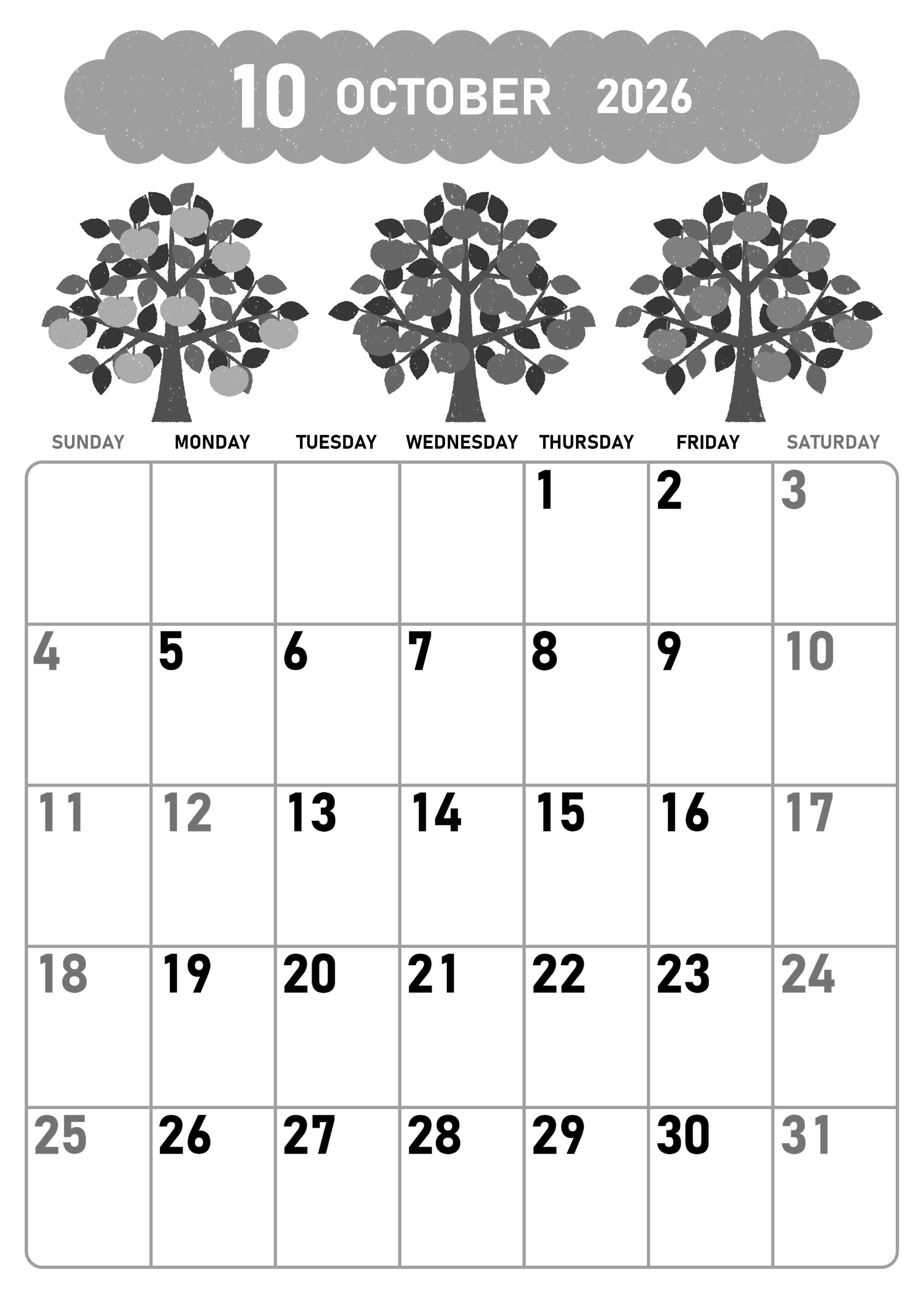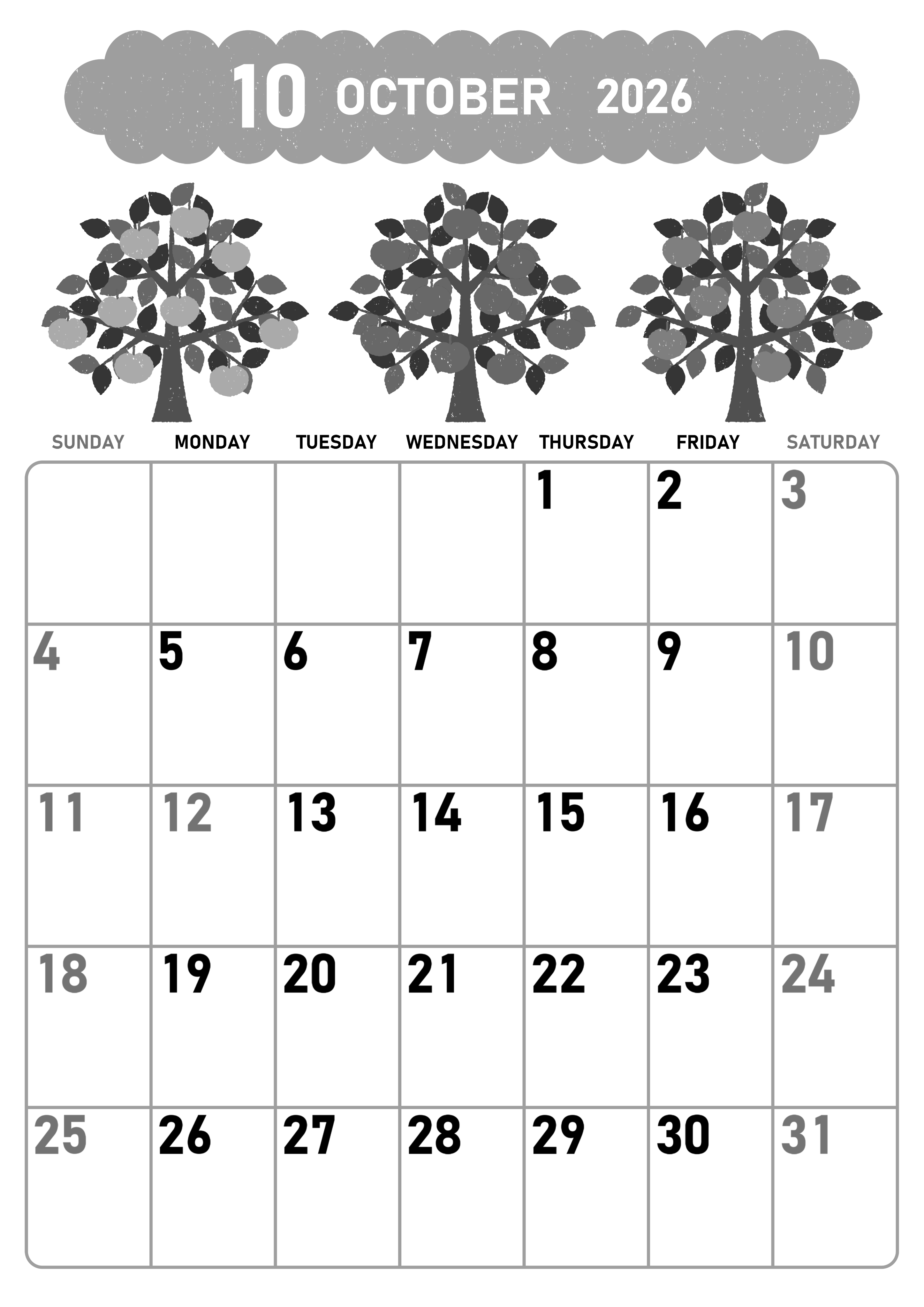 2026年10月縦型モノクロの日曜始まりの無料テンプレート白黒カレンダーです。リンゴの木のイラストがかわいいです。罫線が引かれていて余白もたっぷりで曜日で文字色分けがされているので利便性も高いです。(2026-00421010)