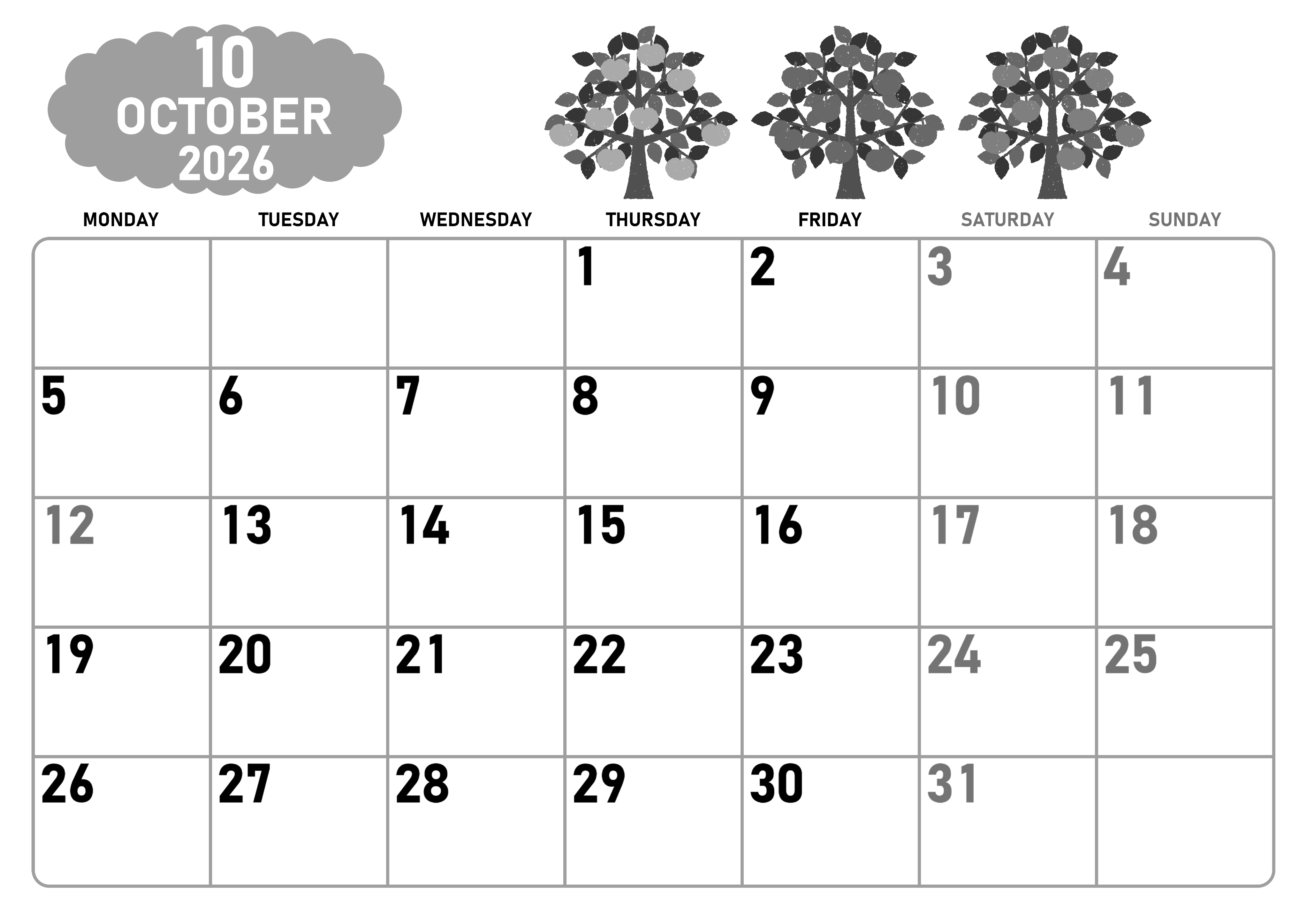 2026年10月横型モノクロの月曜始まりの無料テンプレート白黒カレンダーです。リンゴの木が3本並んでいる様子がとても平和でほのぼのしていてかわいいイラストです。月曜始まりで毎日を充実させるのに向いています。(2026-00421001)