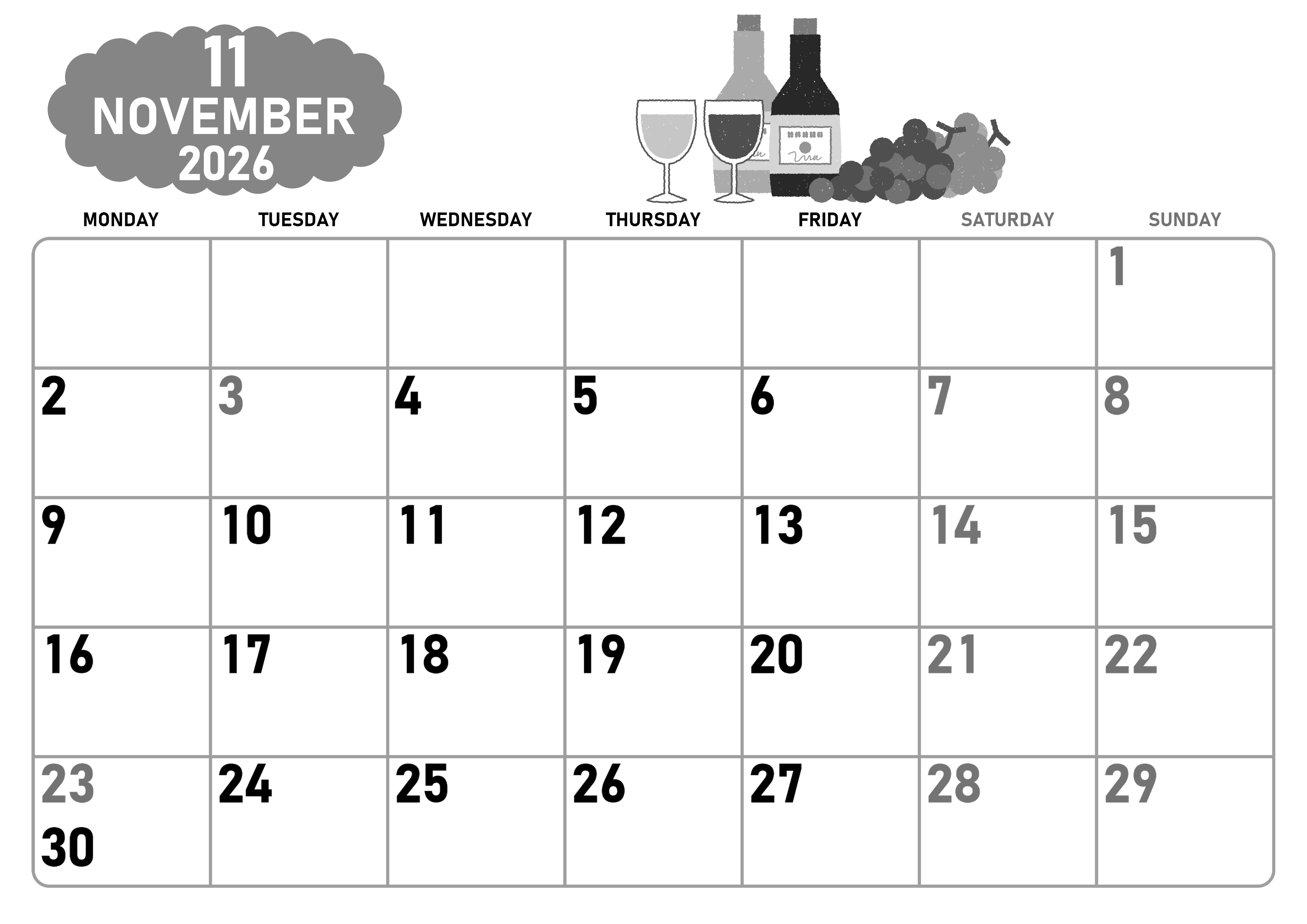 2026年11月横型モノクロの月曜始まりの無料テンプレート白黒カレンダーです。ワインの原料であるぶどうのイラストをかわいいテイストで描いたフリー素材です。月曜始まりで家族や夫婦の計画を立てるのにおすすめです。(2026-00421101)
