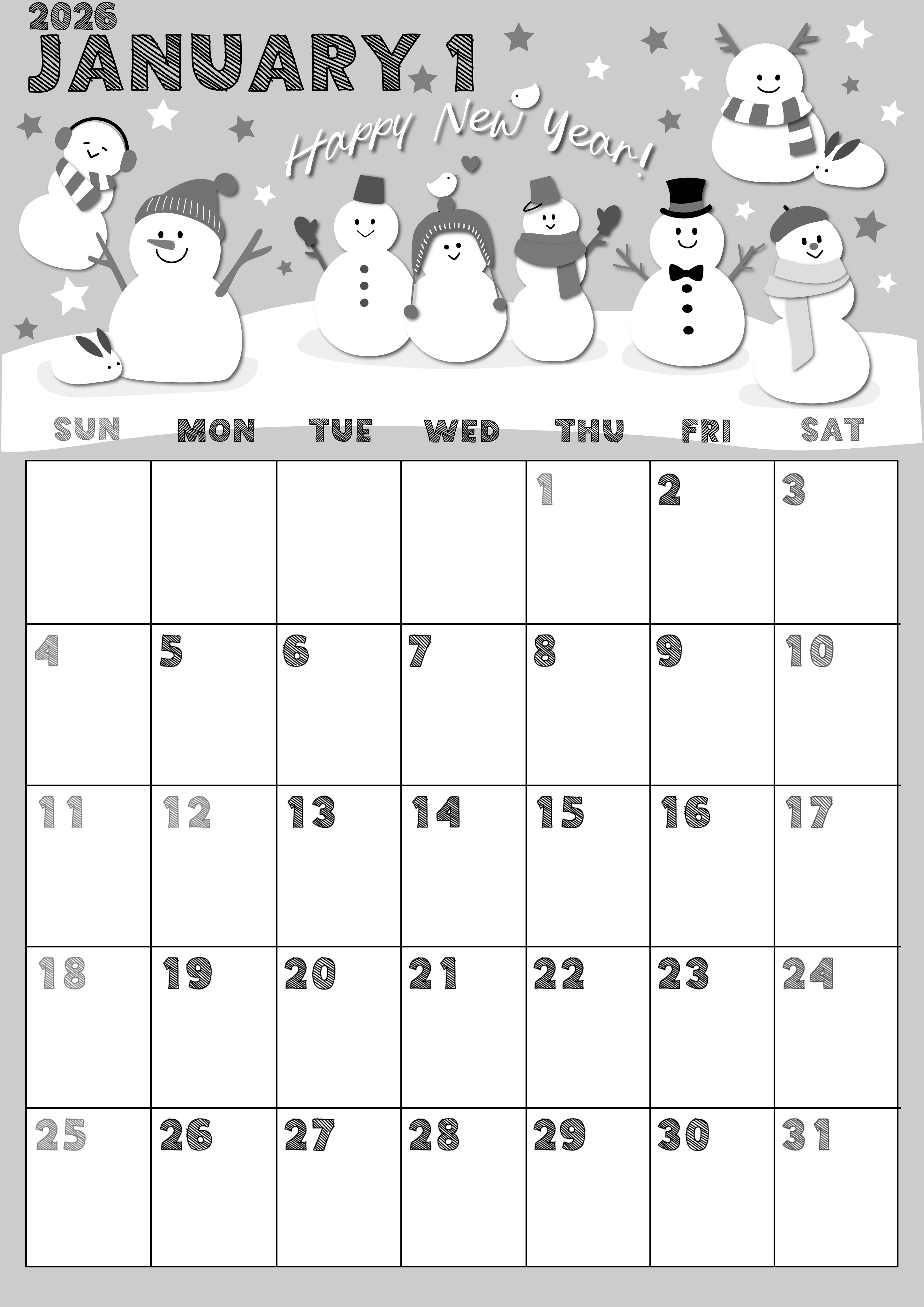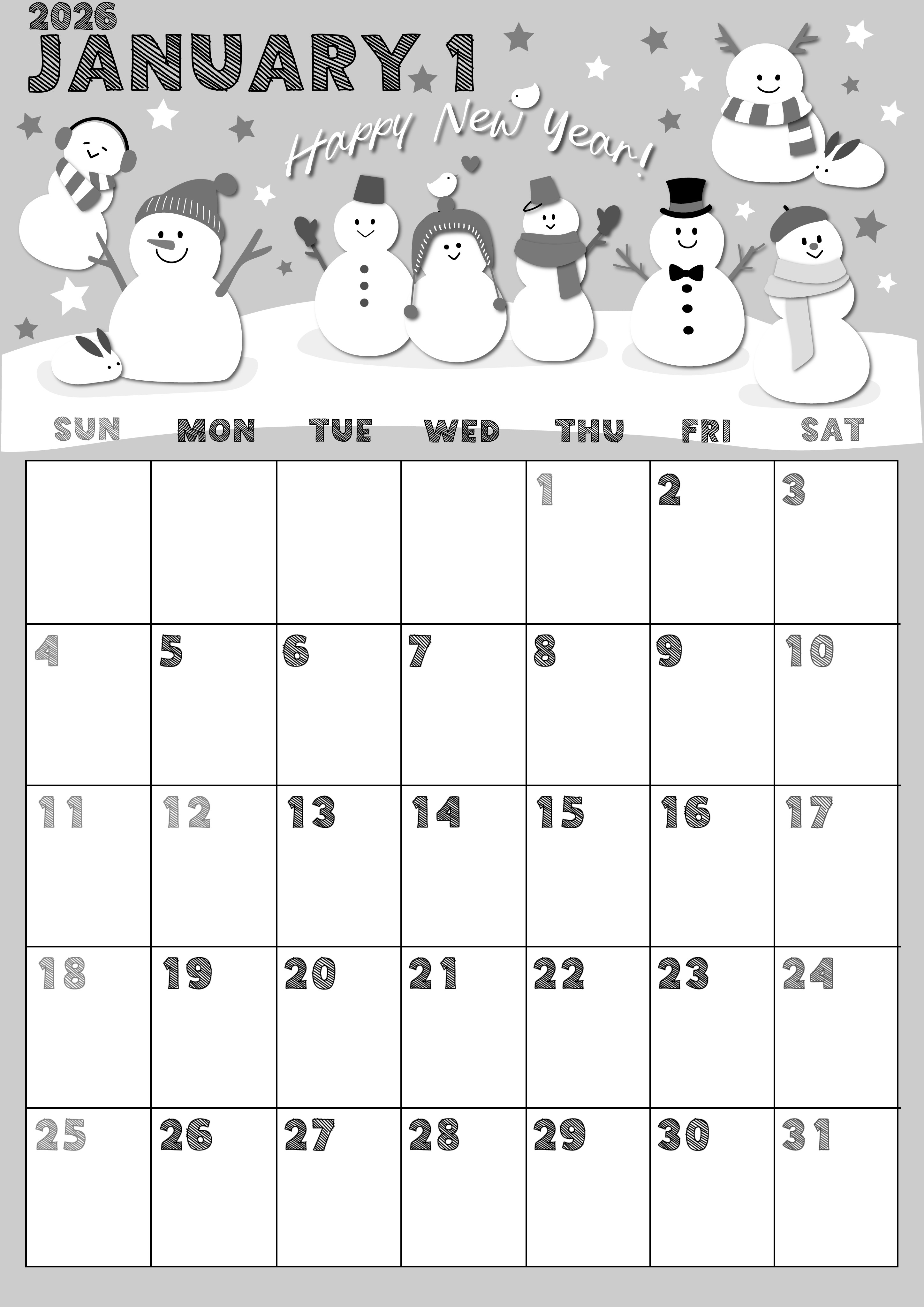 2026年1月縦型モノクロの日曜始まり白黒カレンダーです。いろいろな色の帽子をかぶったスノーマンが新年をお祝いするパーティーをしているかのようなかわいいポップなイラストに元気づけられます。曜日の色分けもされているので勉強などの計画を立てやすい白黒カレンダーです。(2026-00430110)