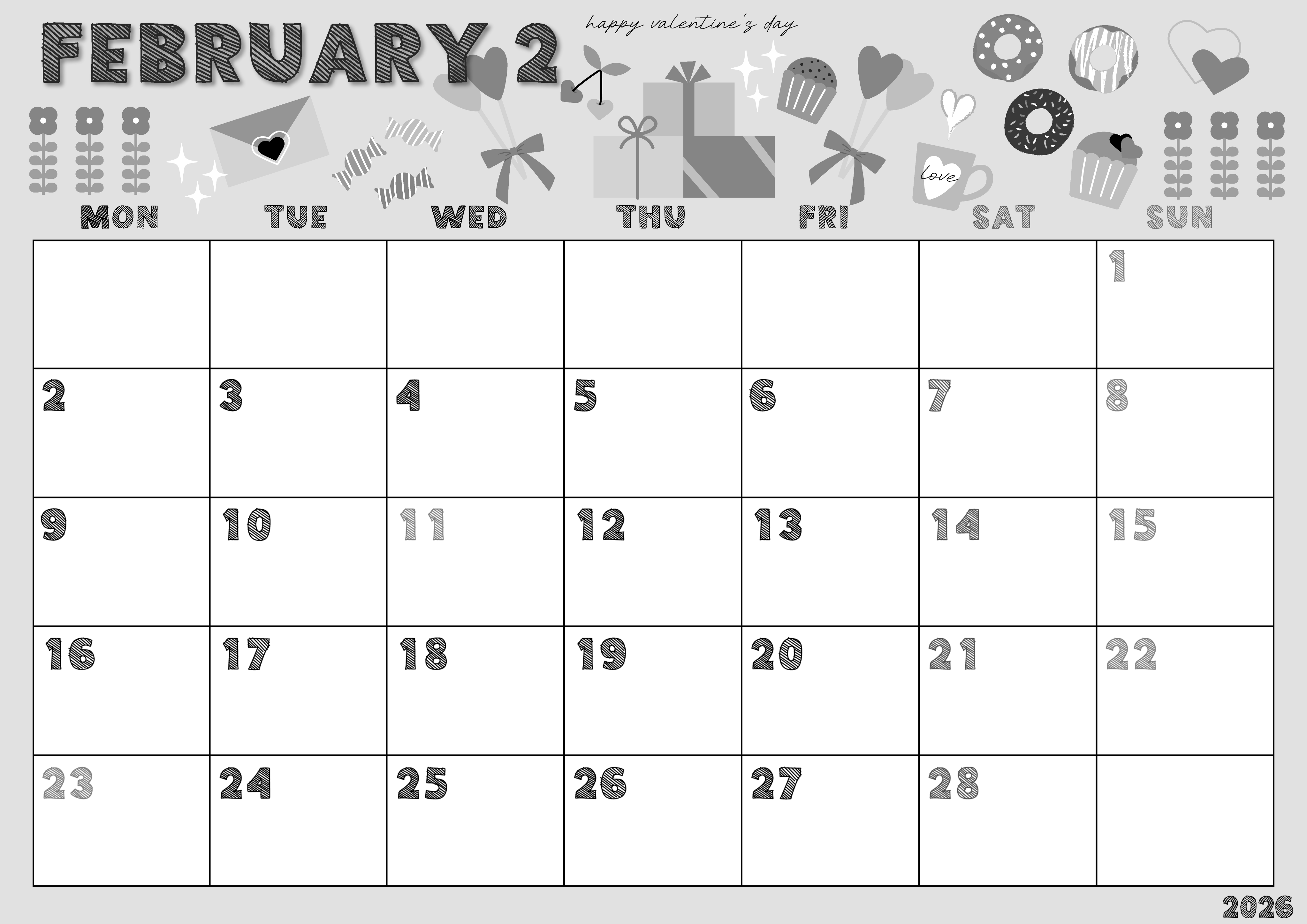2026年2月横型モノクロの月曜始まり かわいいバレンタインイラストA4無料白黒カレンダー(2026-00430201)