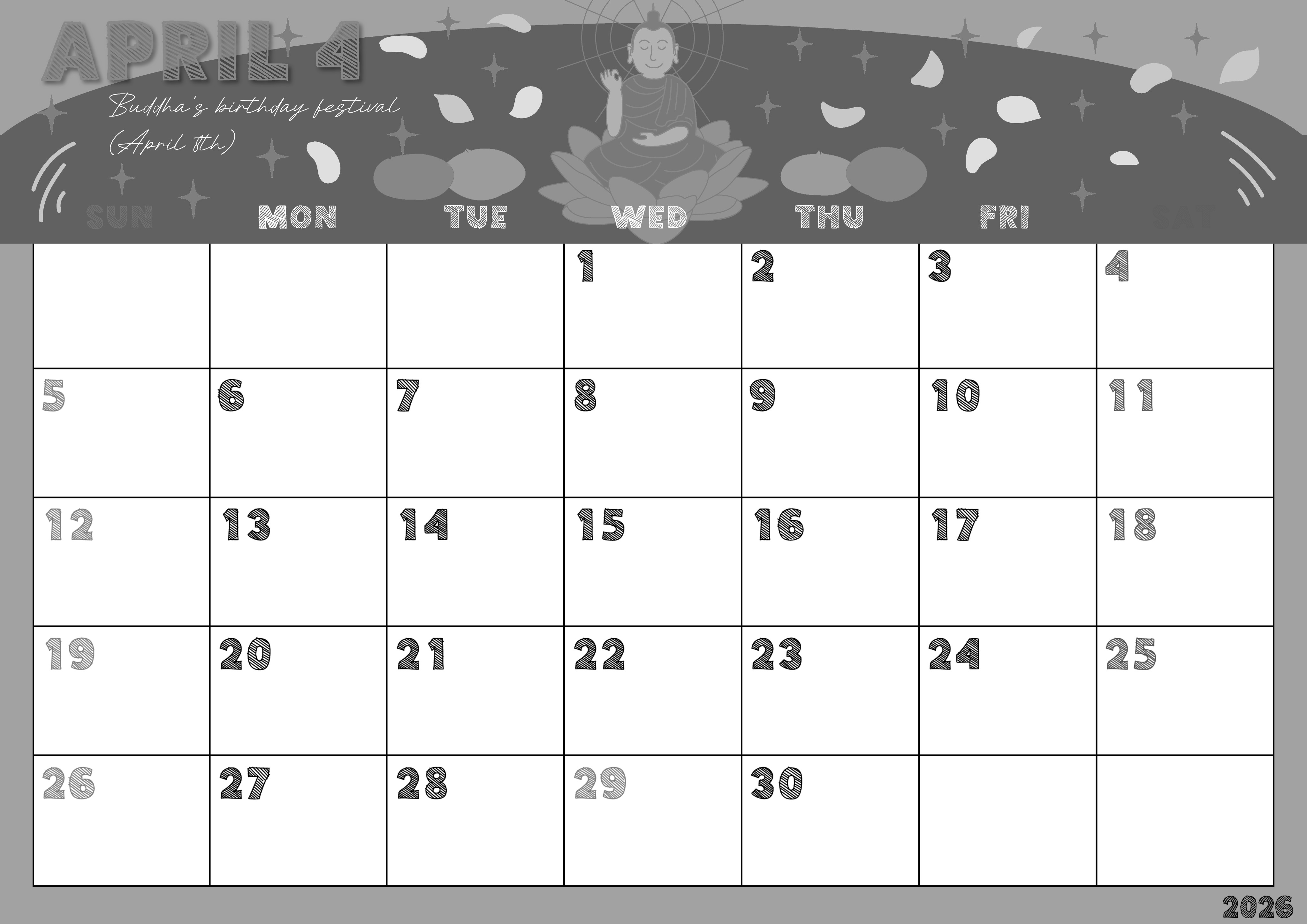 2026年4月横型モノクロの日曜始まりの無料テンプレート白黒カレンダーです。仏さまが中央に居て蓮の葉っぱと桜の花びらに囲まれているめでたいかわいいイラストの無料白黒カレンダーです。A4サイズで汎用的です。(2026-00430400)