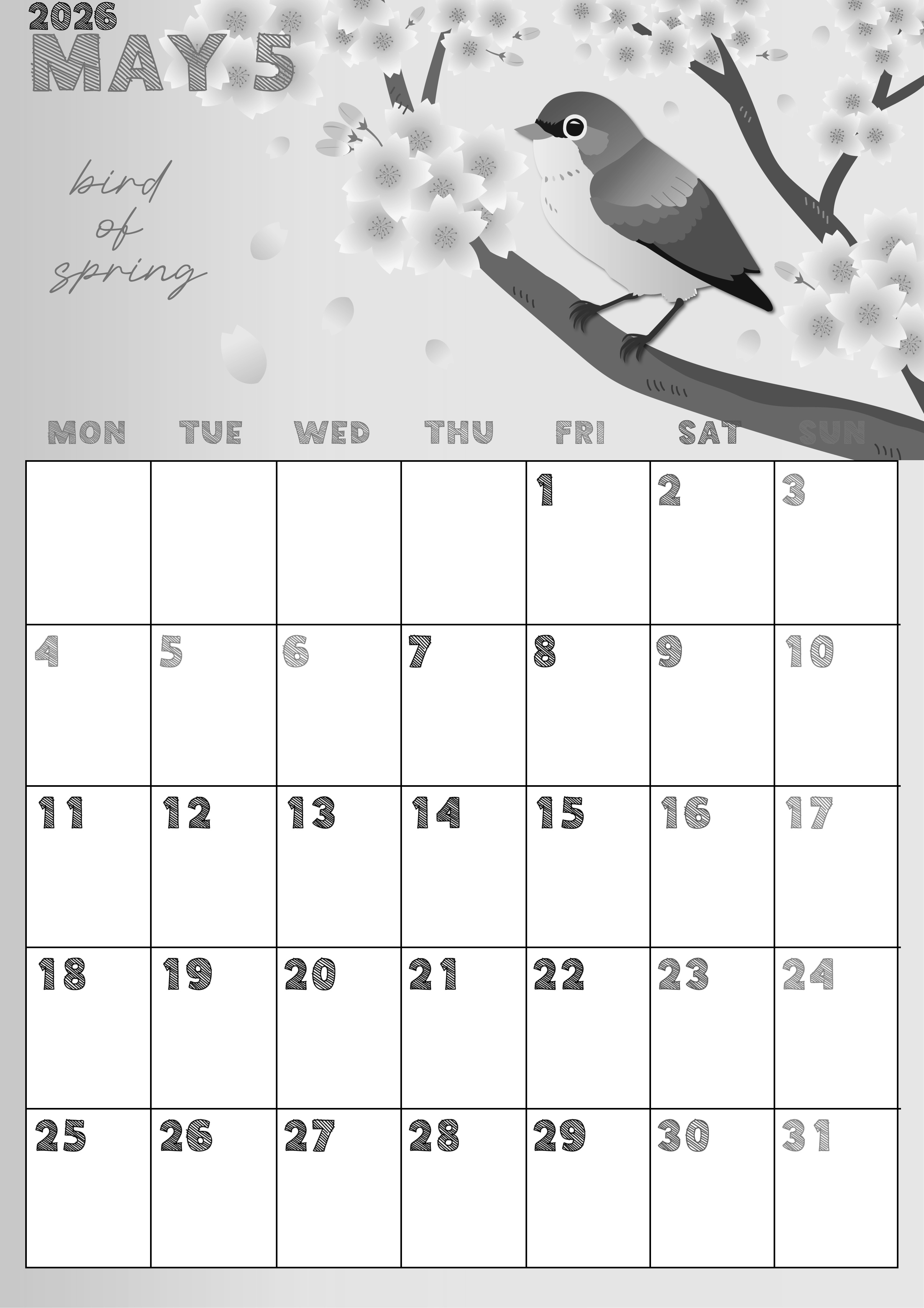 2026年5月縦型モノクロの月曜始まりの無料テンプレート白黒カレンダーです。月曜始まり白黒カレンダーで曜日の文字は色分けされていて欲しいという人に強くおすすめしたい無料素材です。鶯と桜のイラストも平和でかわいいです。(2026-00430511)