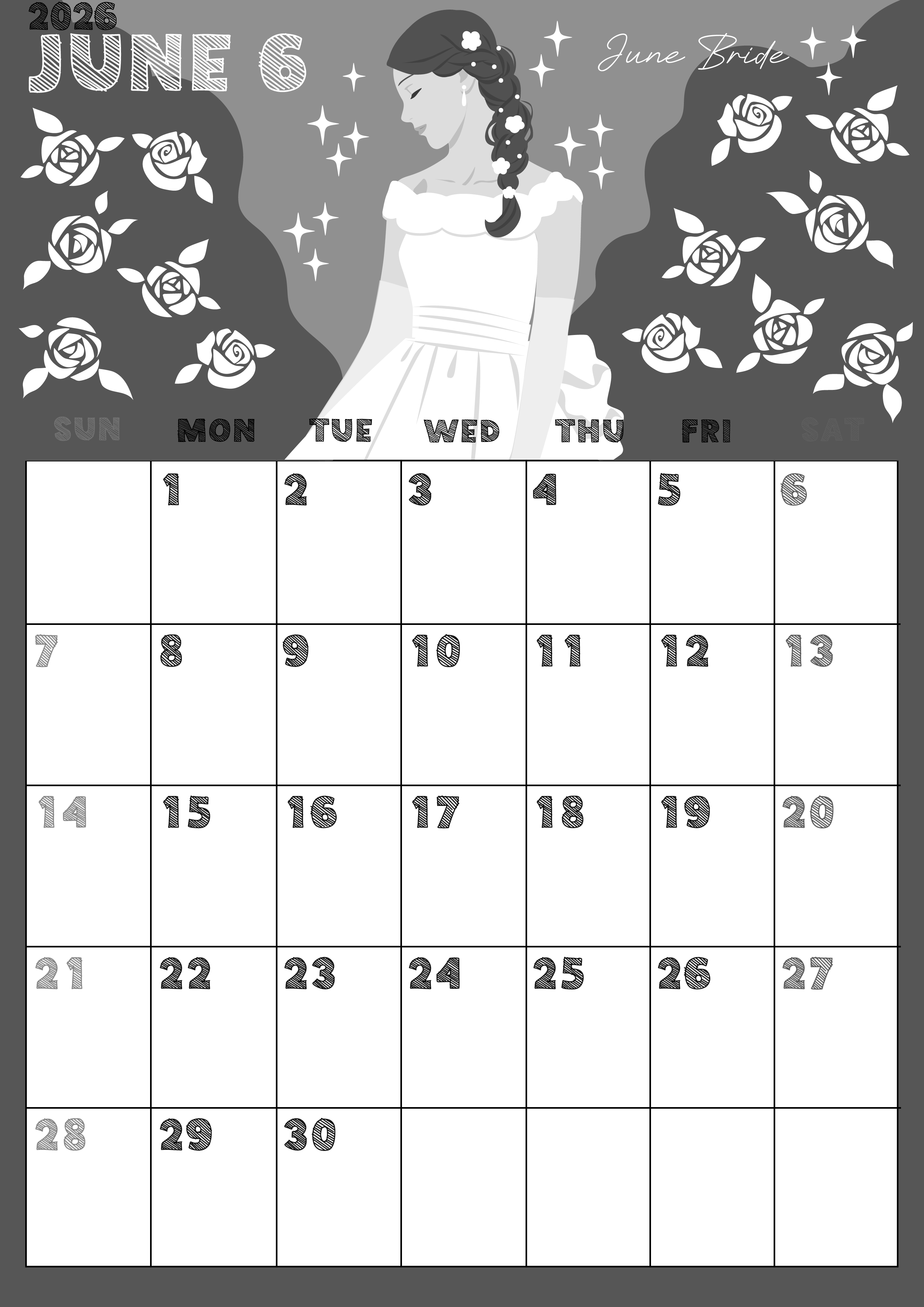 2026年6月縦型モノクロの日曜始まりの無料テンプレート白黒カレンダーです。かわいい白黒カレンダーを探している人におすすめしたい、白薔薇がたっぷり描かれているかわいい花を背景にしたイラストコンテンツです。(2026-00430610)