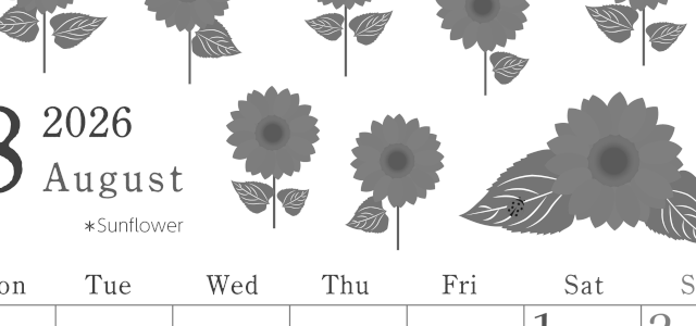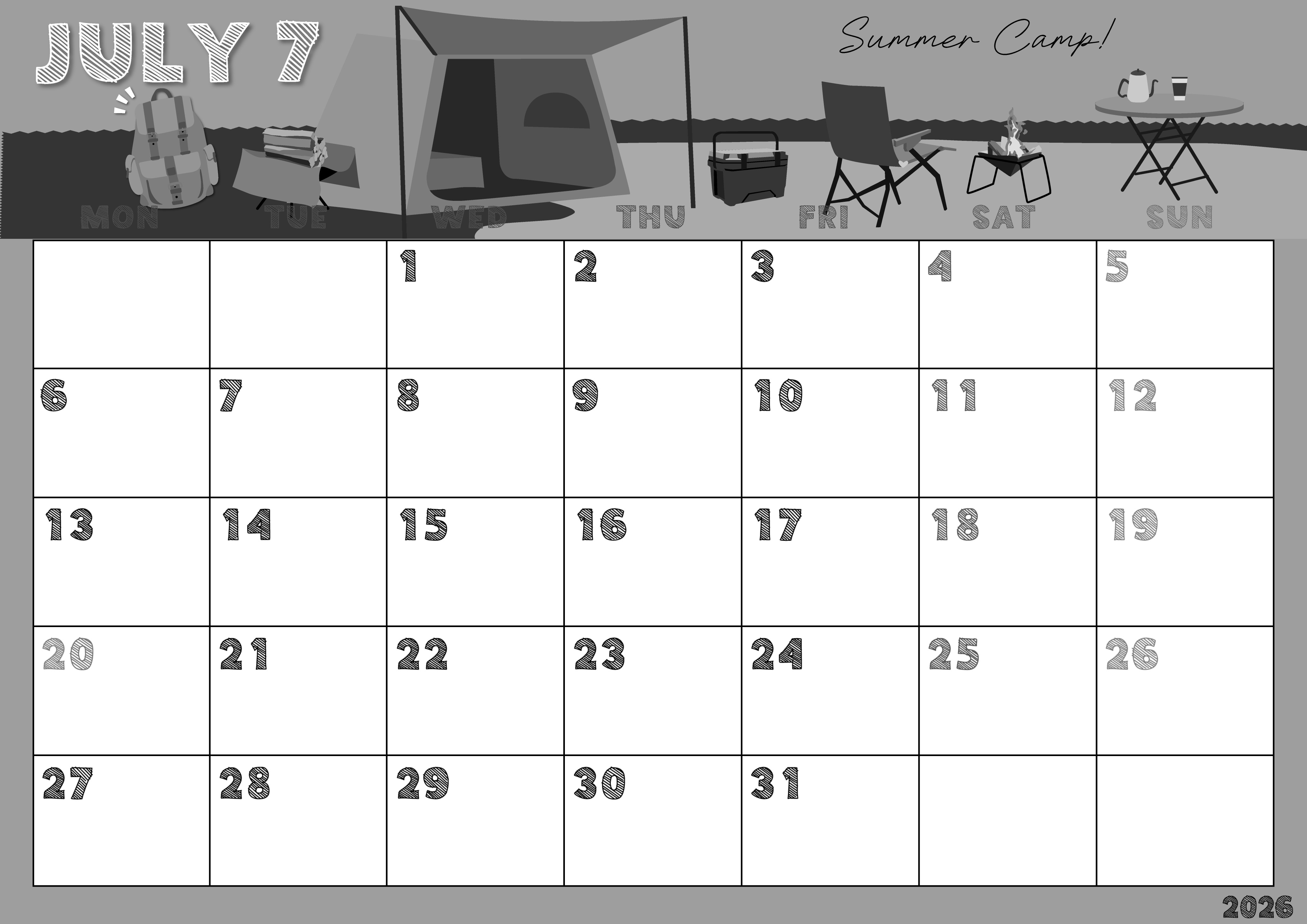 2026年7月横型モノクロの月曜始まりの無料テンプレート白黒カレンダーです。忙しい夏休みの行事を把握するのに適している月曜始まりで曜日によって文字が色分けされたユーザビリティの高いイラストもかわいい白黒カレンダーです。(2026-00430701)