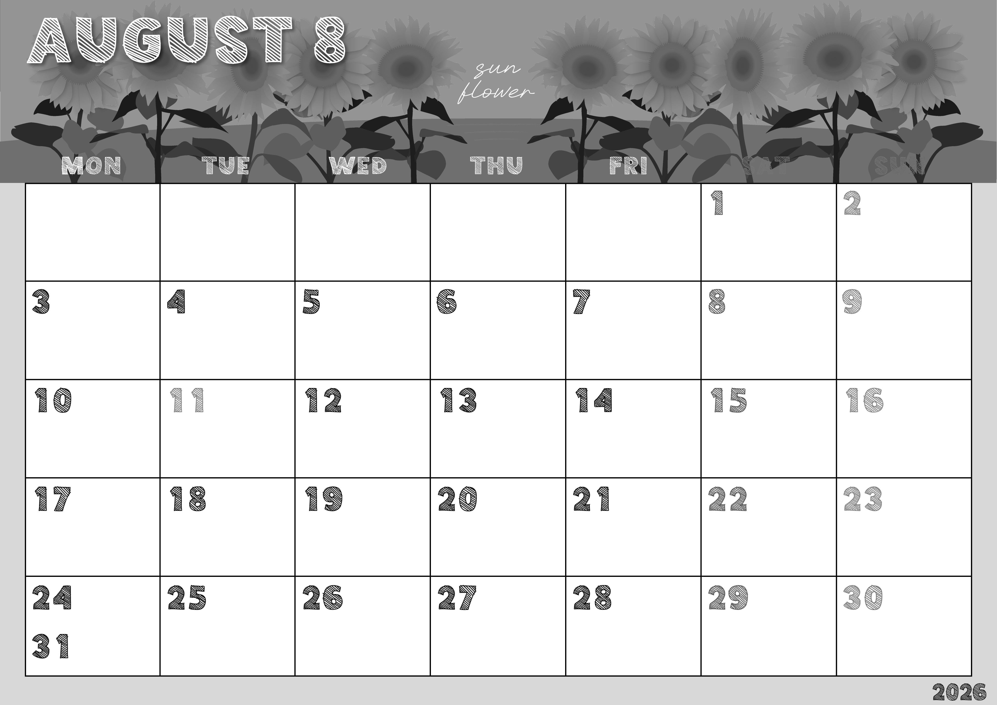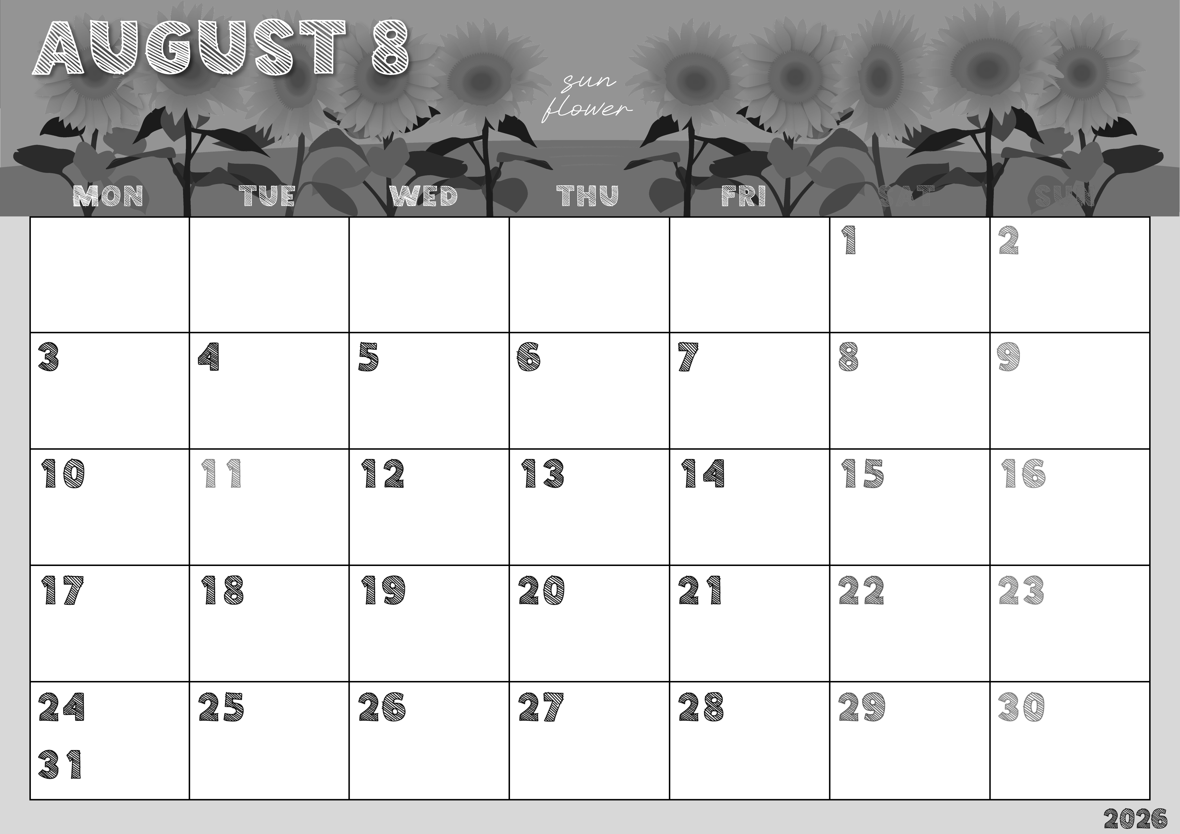 2026年8月横型モノクロの月曜始まりの無料テンプレート白黒カレンダーです。パッと見ても夏らしい雰囲気がグッと伝わってくるようなかわいいイラストが特徴の月曜始まりでタスク管理がやりやすい無料の白黒カレンダーとなっています。(2026-00430801)