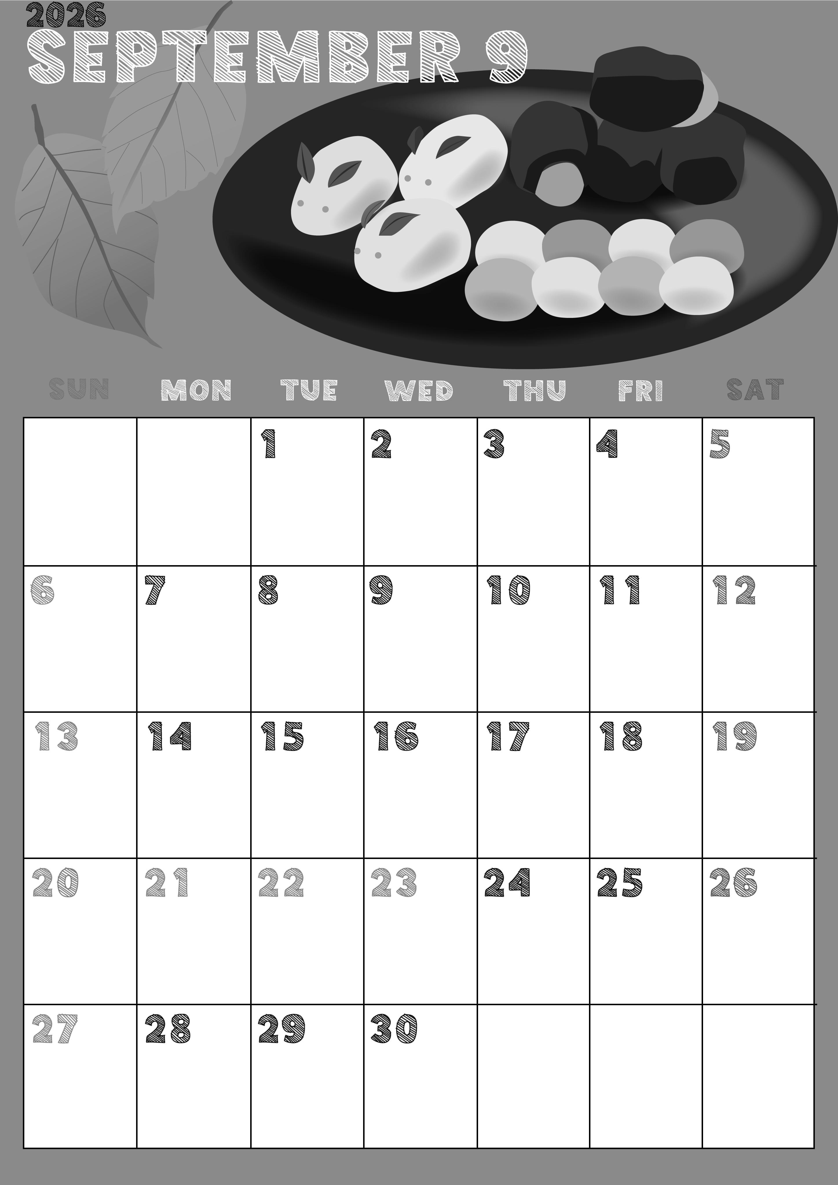 2026年・無料のカレンダーテンプレート 2026年9月縦型モノクロの日曜始まり 和菓子イラストのかわいいA4無料白黒カレンダー(2026-00430910) 素材状デザイン王 2025年4月1日 2026年9月縦型モノクロの日曜始まりの無料テンプレート白黒カレンダーです。うさぎの形をしている和菓子をはじめとして食べたいなと思わせるような細かい描写がとてもかわいいイラスト素材となっています。(2026-00430910) 9月 縦型のカレンダー 日曜始まり 白黒 カレンダーデザイン-0043