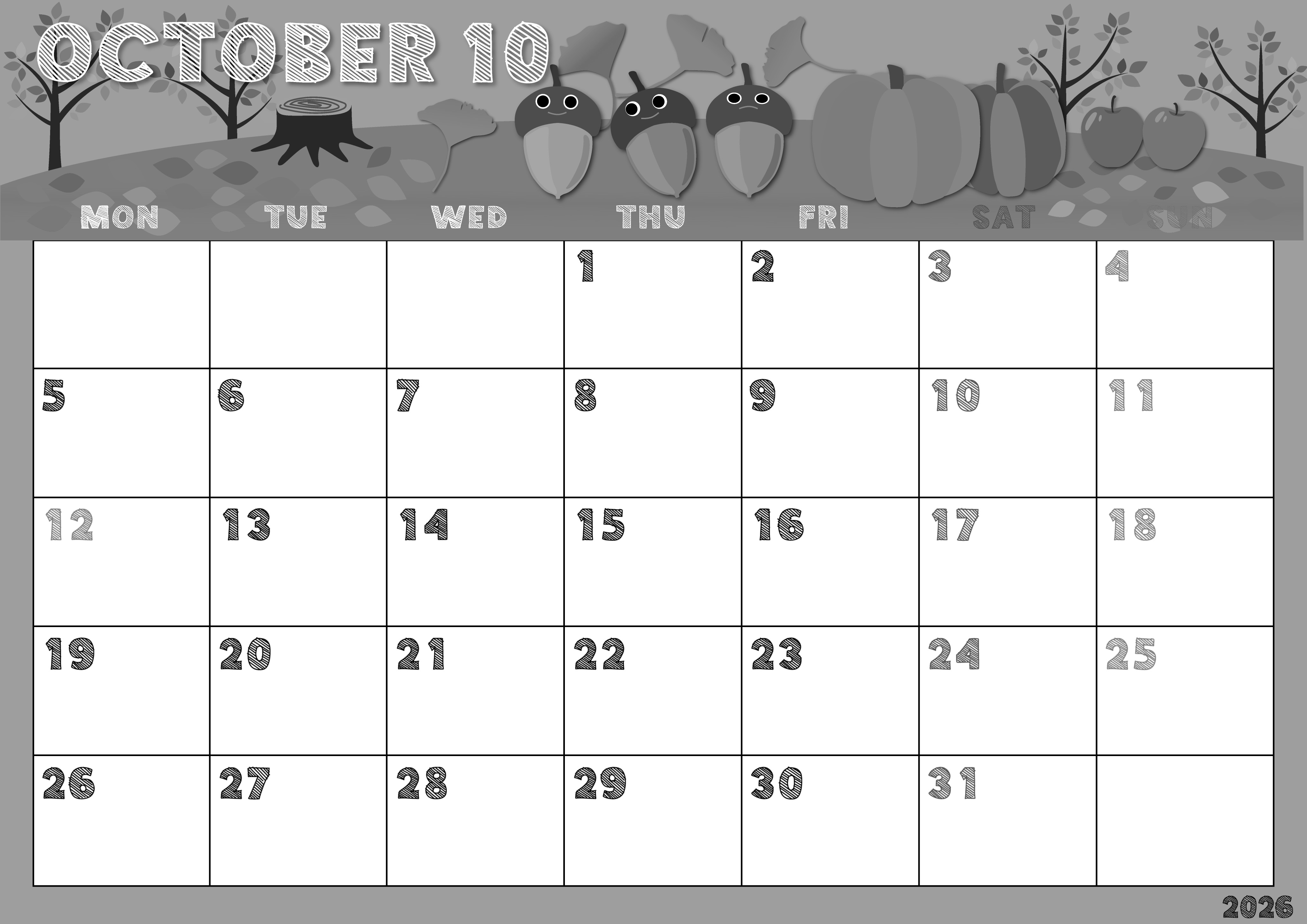 2026年・無料のカレンダーテンプレート 2026年10月横型モノクロの月曜始まり 秋の季節イラストのかわいいA4無料白黒カレンダー(2026-00431001) 素材状デザイン王 2025年4月1日 2026年10月横型モノクロの月曜始まりの無料テンプレート白黒カレンダーです。切り株や枯れ木やドングリやリンゴやカボチャといった秋の季節のアイテムが盛り沢山なかわいいイラストコンテンツです。(2026-00431001) 10月 横型のカレンダー 月曜始まり 白黒 カレンダーデザイン-0043