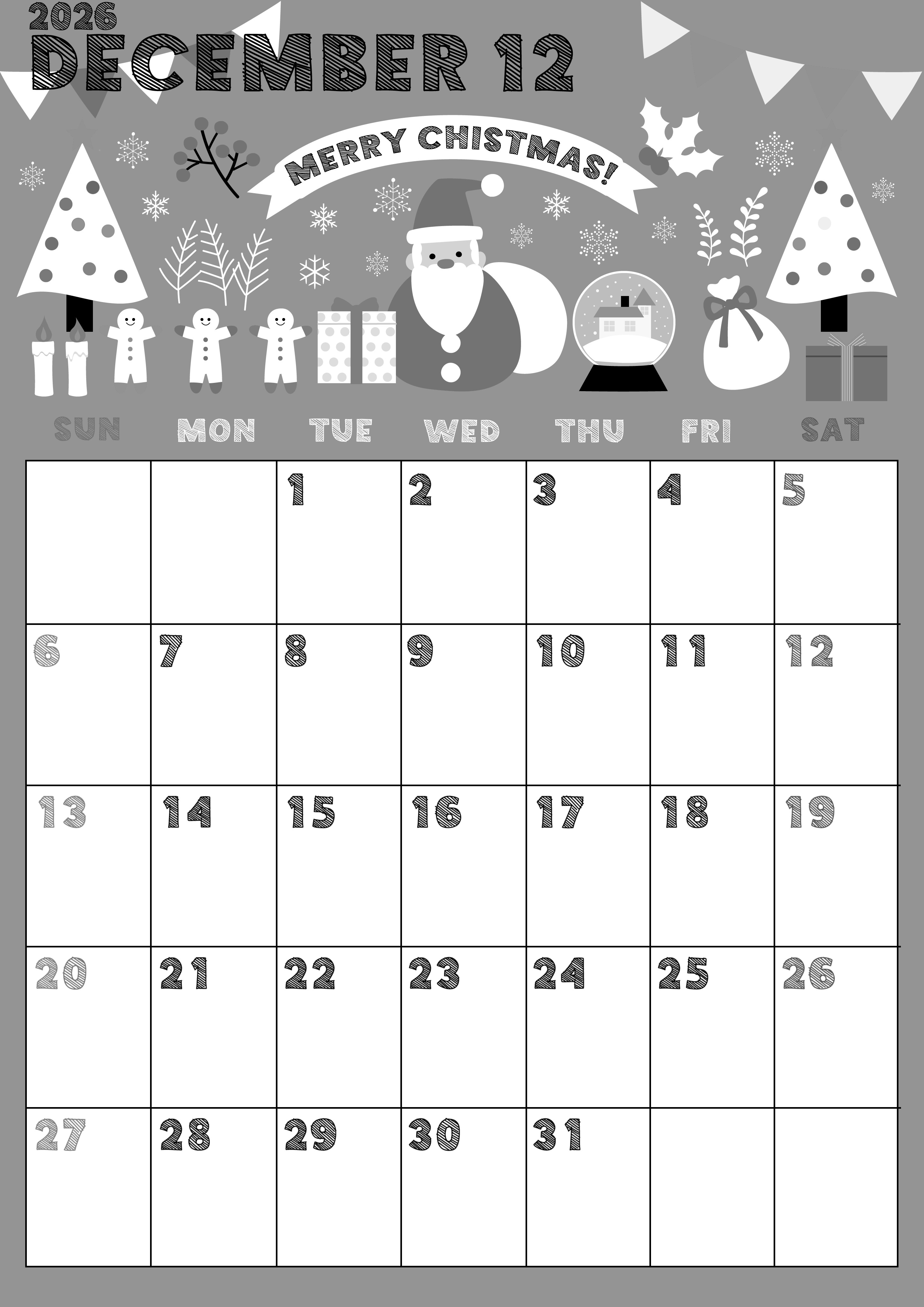 2026年12月縦型モノクロの日曜始まりの無料テンプレート白黒カレンダーです。季節の行事を意識させてくれる身近なコンテンツのひとつが白黒カレンダーです。その白黒カレンダーにかわいいイラスト要素をしっかりと詰め込みました。(2026-00431210)