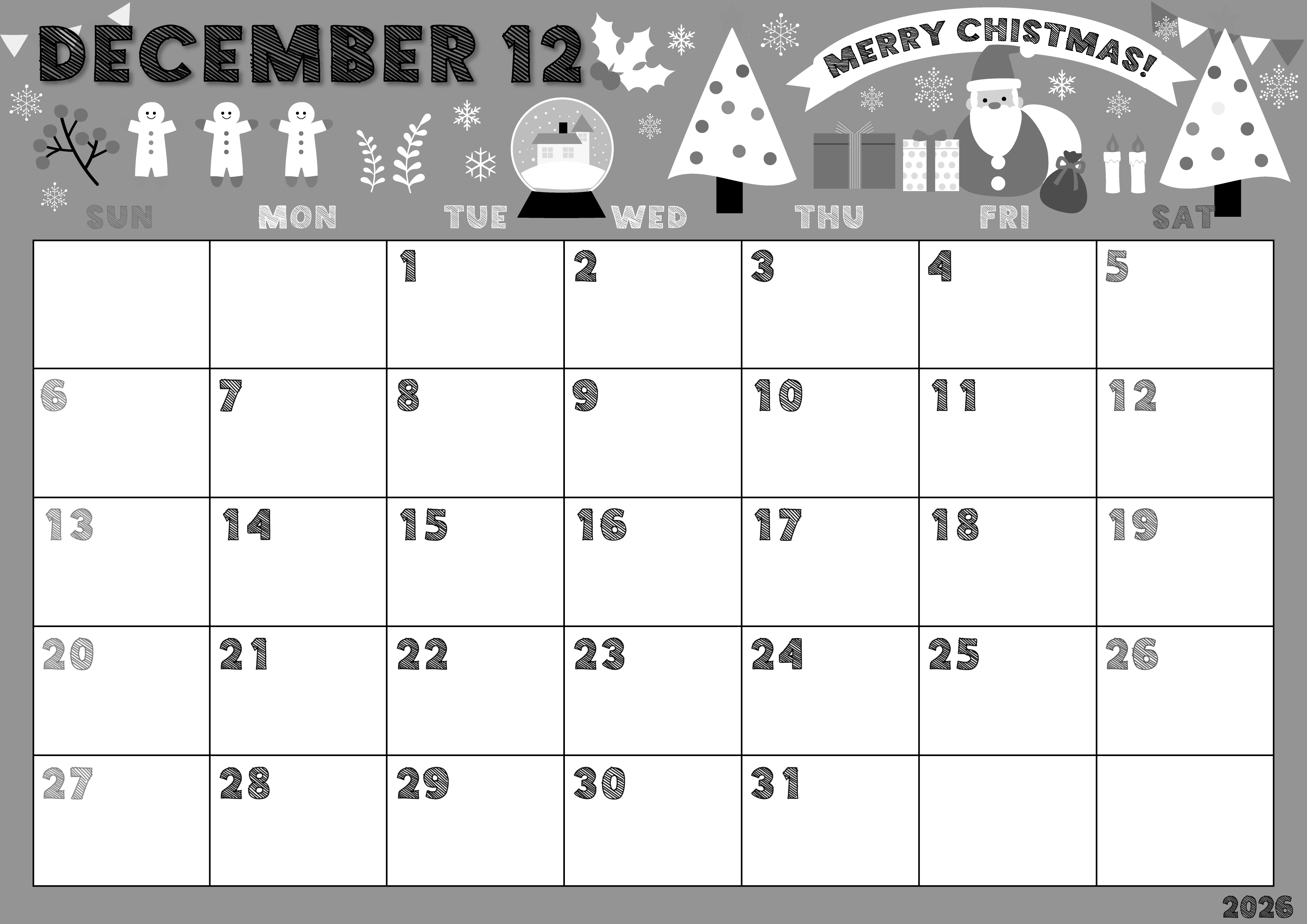 2026年12月横型モノクロの日曜始まりの無料テンプレート白黒カレンダーです。ポップに季節の行事を元気いっぱいに描いたかわいいイラストです。文字部分もかすれたように色塗りがされているデザインでどこまでもかわいいです。(2026-00431200)