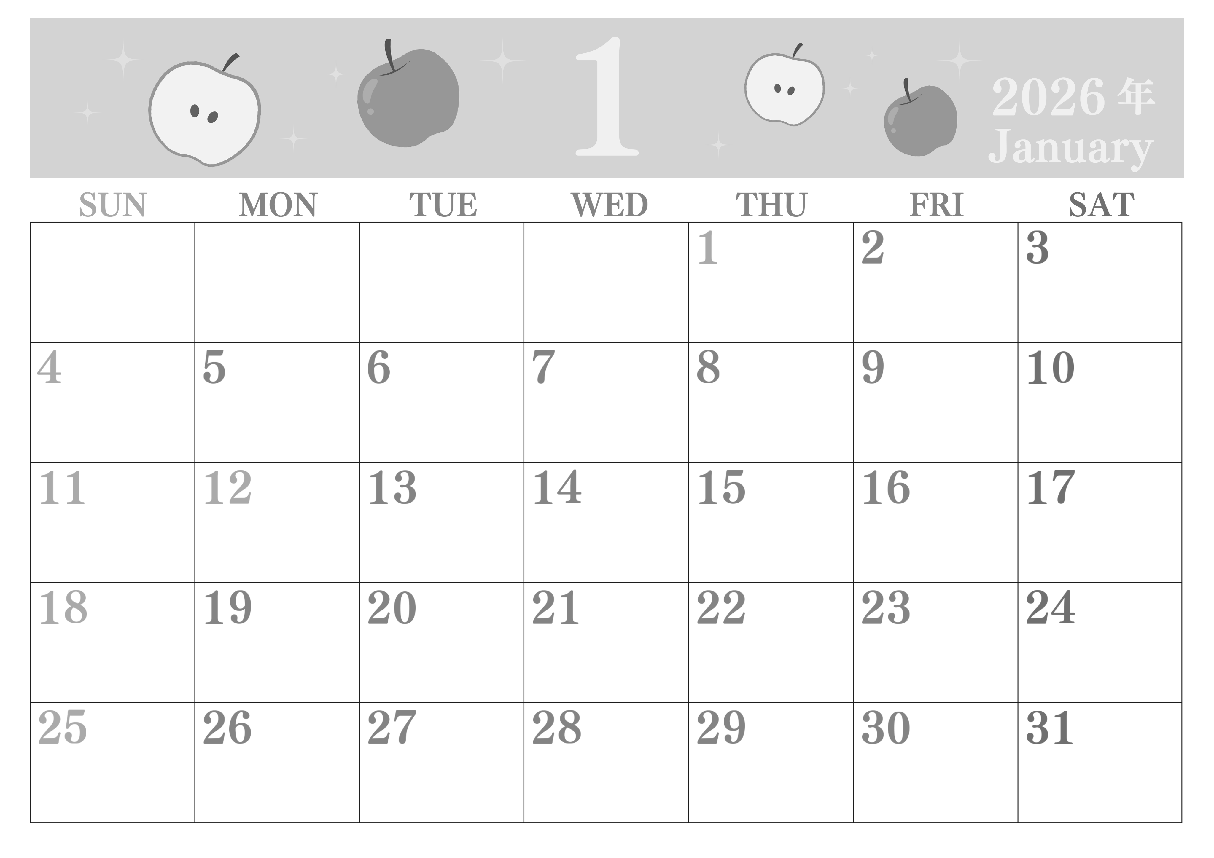 2026年1月横型モノクロの日曜始まり白黒カレンダーです。ツヤツヤでフレッシュなりんごがちりばめられたフルーティーでガーリーでかわいい白黒カレンダーです。曜日によって色分けされているのでタスク管理に便利なフリー素材です。(2026-00440100)