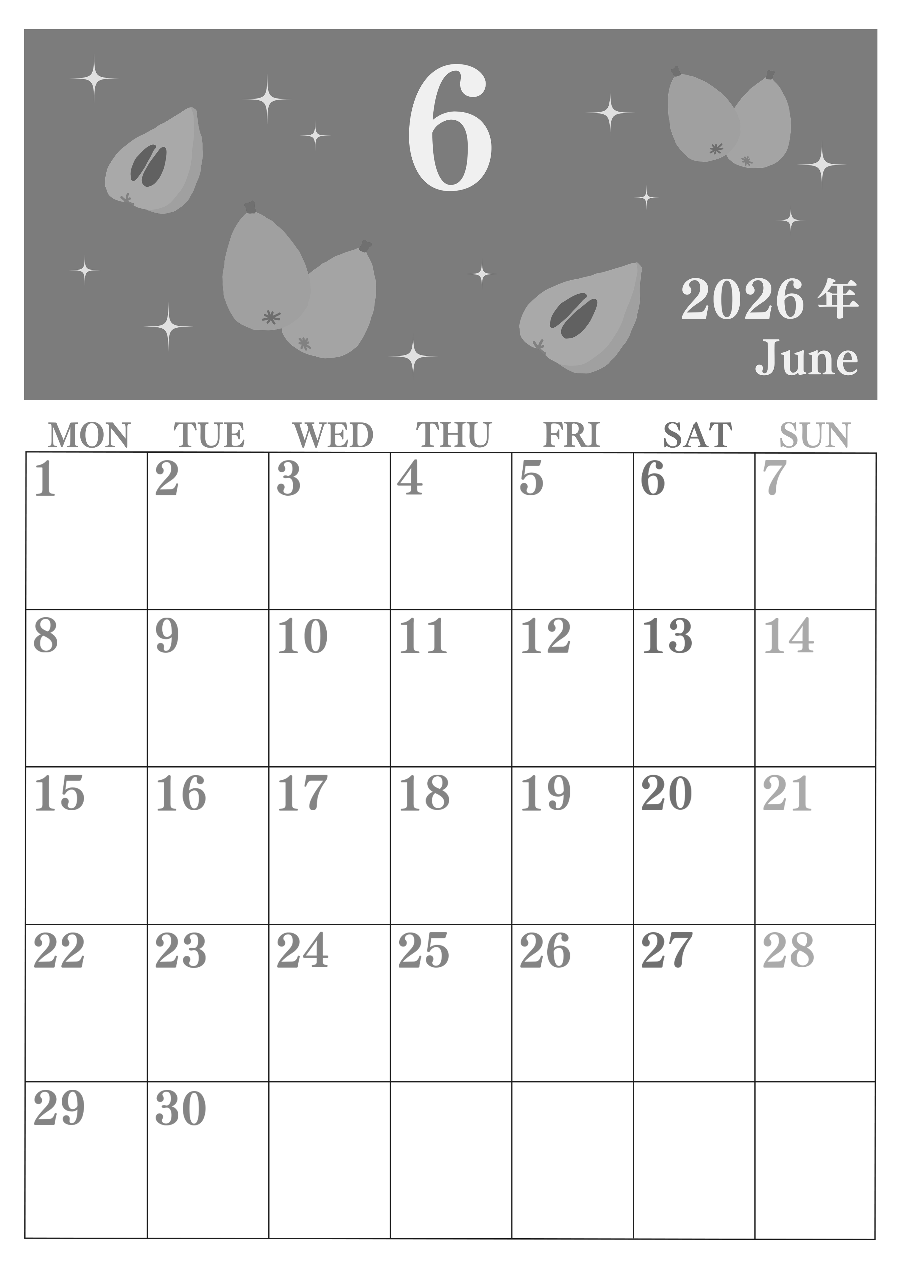 2026年6月縦型モノクロの月曜始まりの無料テンプレート白黒カレンダーです。月曜始まりでスケジュールをたくさん書き込みできるびわのフルーツのイラストもかわいい白黒カレンダーです。忙しい毎日をより充実させるツールになります。(2026-00440611)