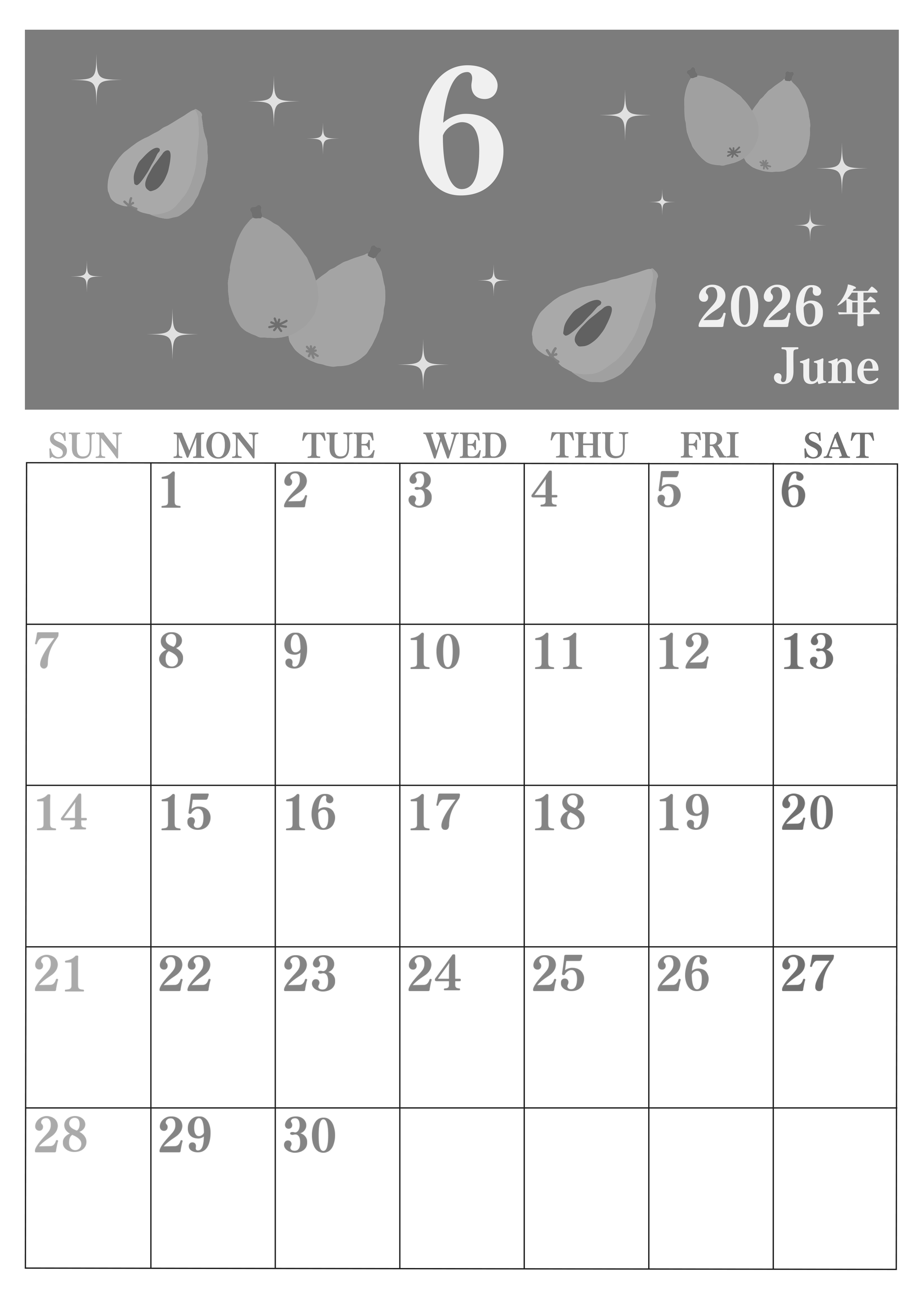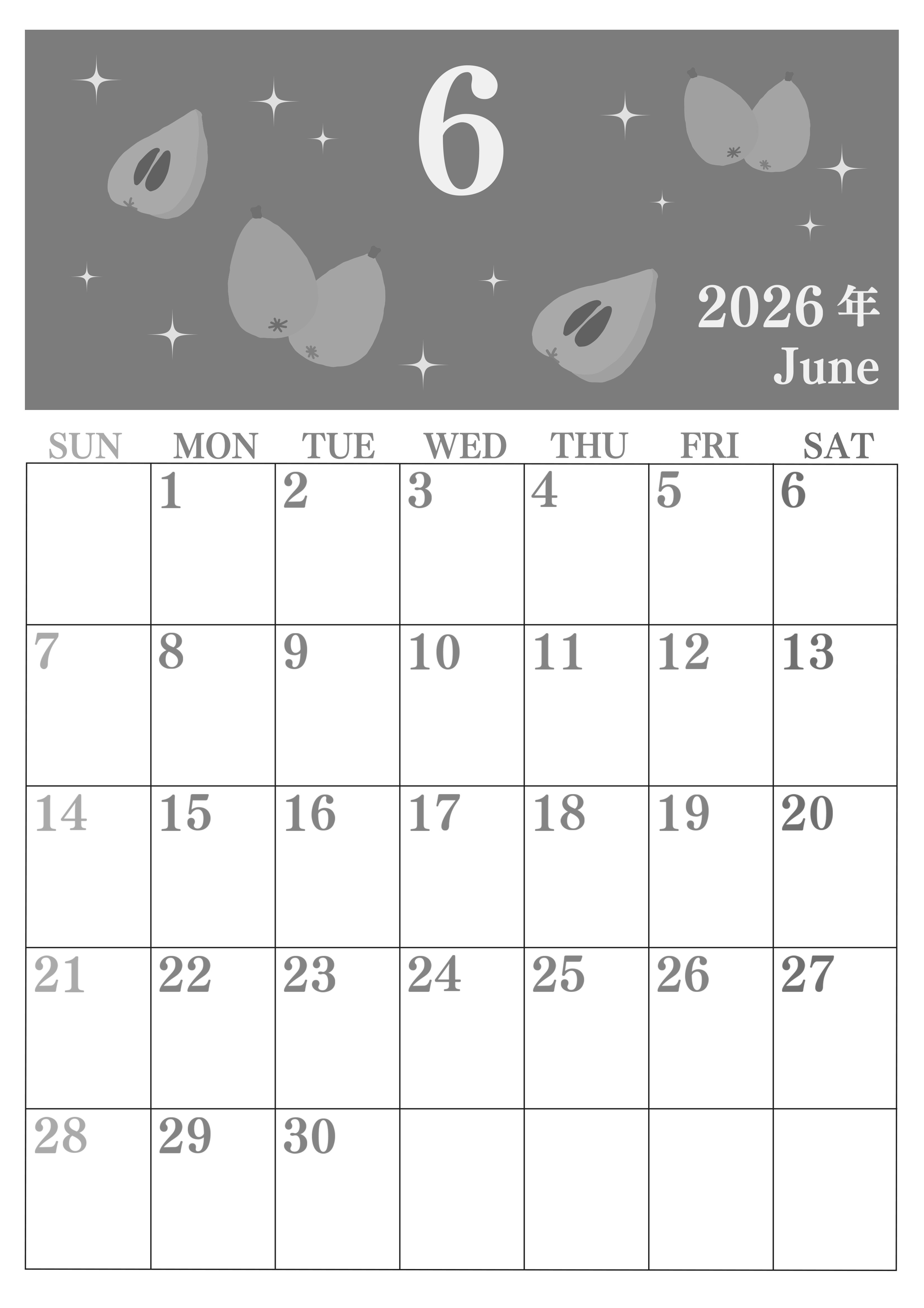 2026年6月縦型モノクロの日曜始まりの無料テンプレート白黒カレンダーです。タスク管理に適切な無料白黒カレンダーがおすすめです。イラストはびわの実をモチーフにしているのでみずみずしくてかわいいです。(2026-00440610)