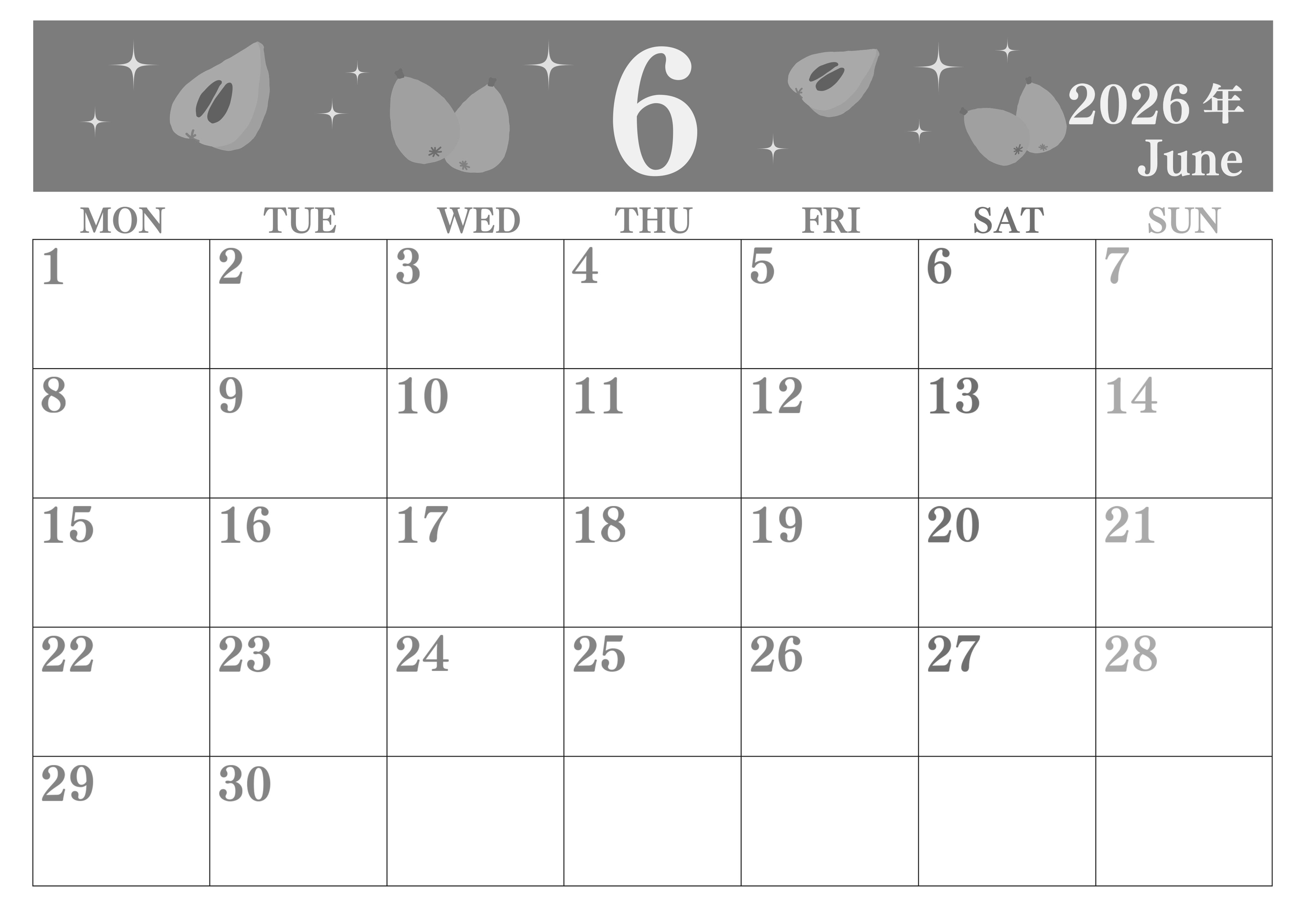 2026年6月横型モノクロの月曜始まりの無料テンプレート白黒カレンダーです。月曜始まりでA4横向きの白黒カレンダーは実用性が他界だけでなくフルーツであるびわのイラストがとてもかわいい使うのが楽しくなるフリー素材です。(2026-00440601)
