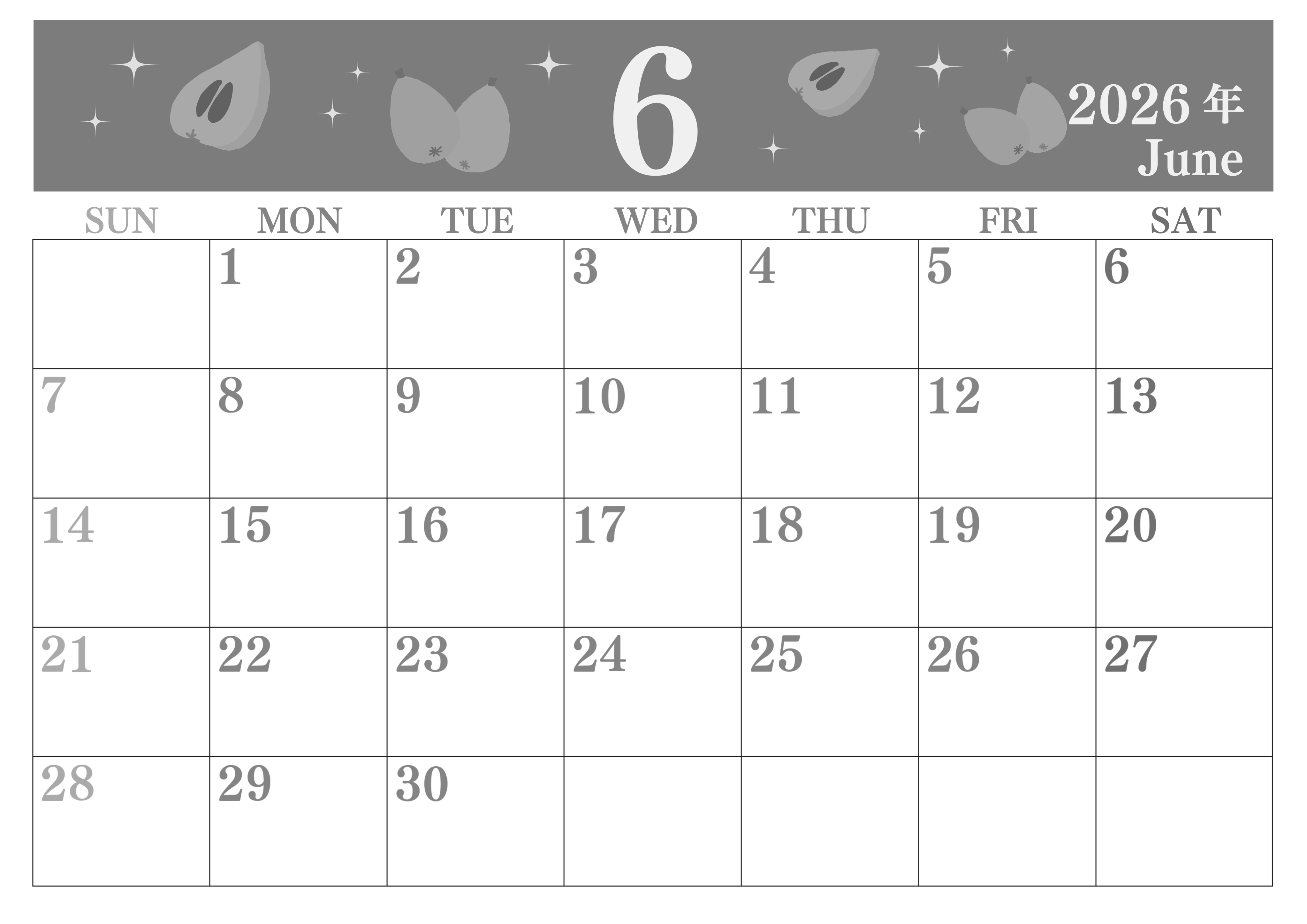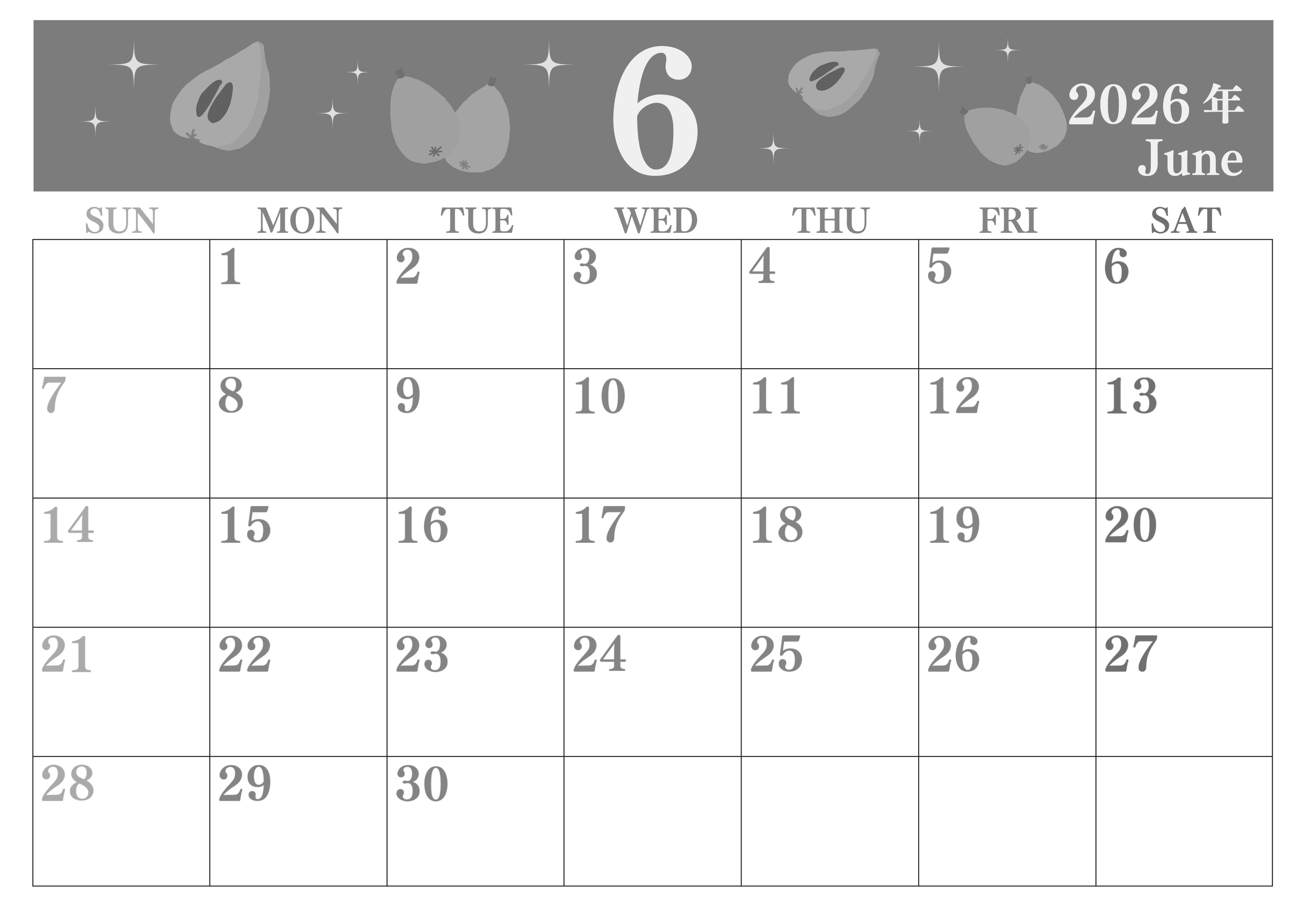 2026年・無料のカレンダーテンプレート 2026年6月横型モノクロの日曜始まり びわのイラストがかわいいA4無料白黒カレンダー(2026-00440600) 素材状デザイン王 2025年4月1日 2026年6月横型モノクロの日曜始まりの無料テンプレート白黒カレンダーです。背景にびわのイラストが落ち着いていてかわいいイラスト白黒カレンダーです。罫線が引かれているので利便性が高いです。(2026-00440600) 6月 横型のカレンダー 日曜始まり 白黒 カレンダーデザイン-0044