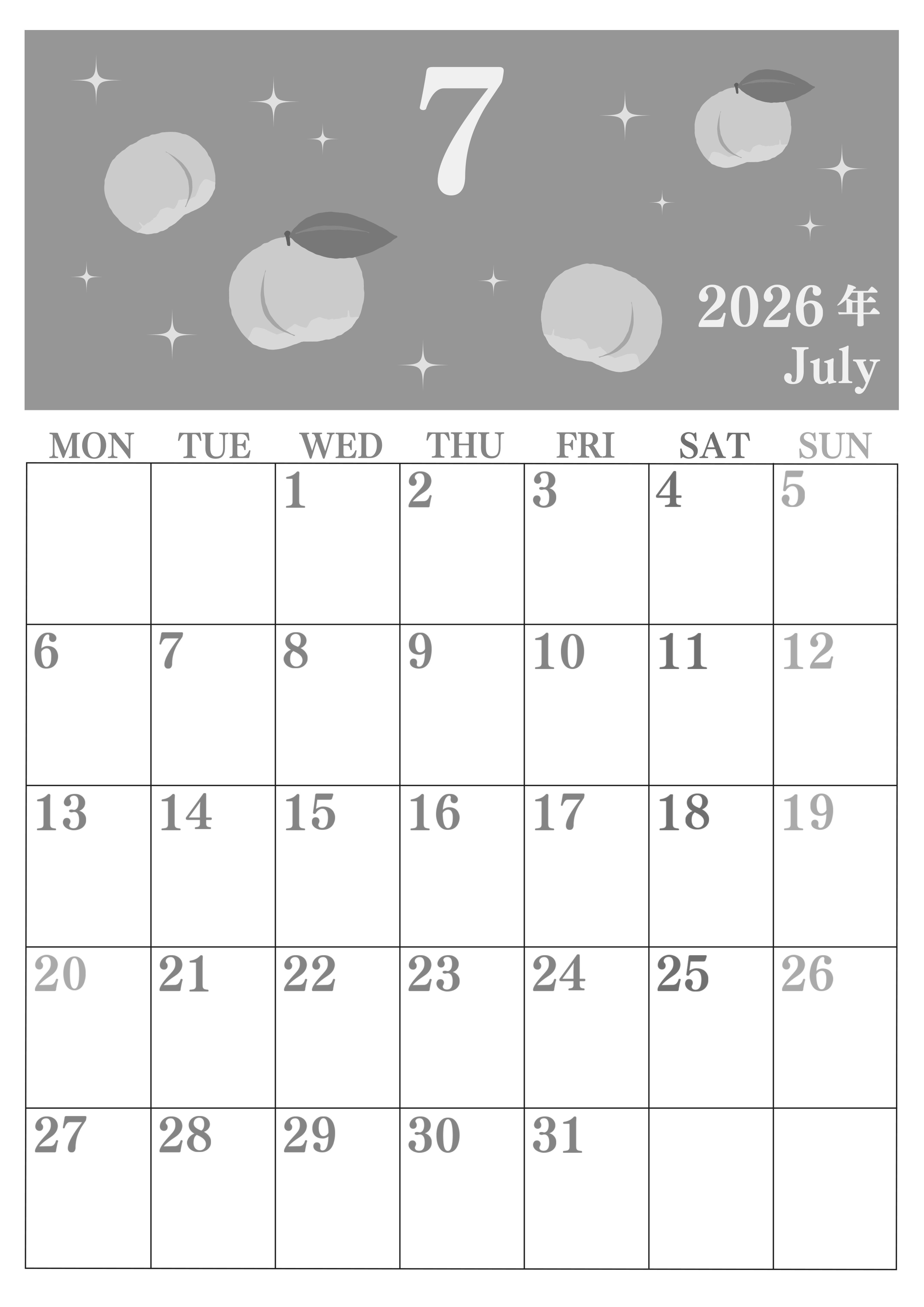 2026年・無料のカレンダーテンプレート 2026年7月縦型モノクロの月曜始まり 桃のイラストがかわいいA4無料白黒カレンダー(2026-00440711) 素材状デザイン王 2025年4月1日 2026年7月縦型モノクロの月曜始まりの無料テンプレート白黒カレンダーです。桃のイラストがおいしそうでかわいいデザインです。白黒カレンダー部分は余白がたっぷりなので書き込みしやすいです。(2026-00440711) 7月 縦型のカレンダー 月曜始まり 白黒 カレンダーデザイン-0044
