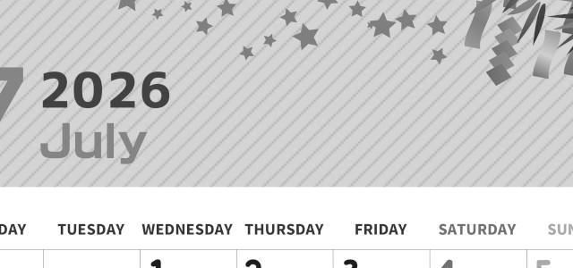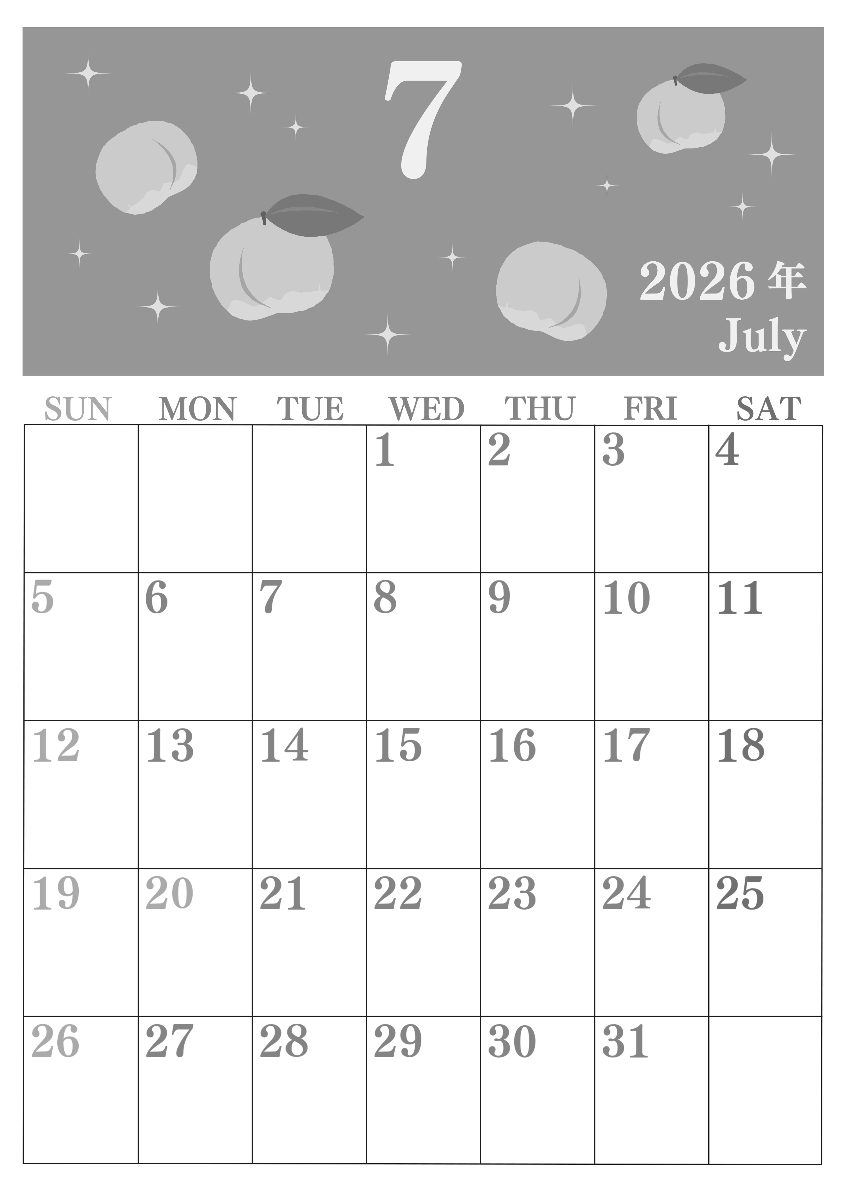 2026年7月縦型モノクロの日曜始まりの無料テンプレート白黒カレンダーです。縦向きでA4サイズなので壁に貼るのにちょうどいい大きさの白黒カレンダーです。イラストは桃をメインテーマに取り上げていてみずみずしくかわいいです。(2026-00440710)
