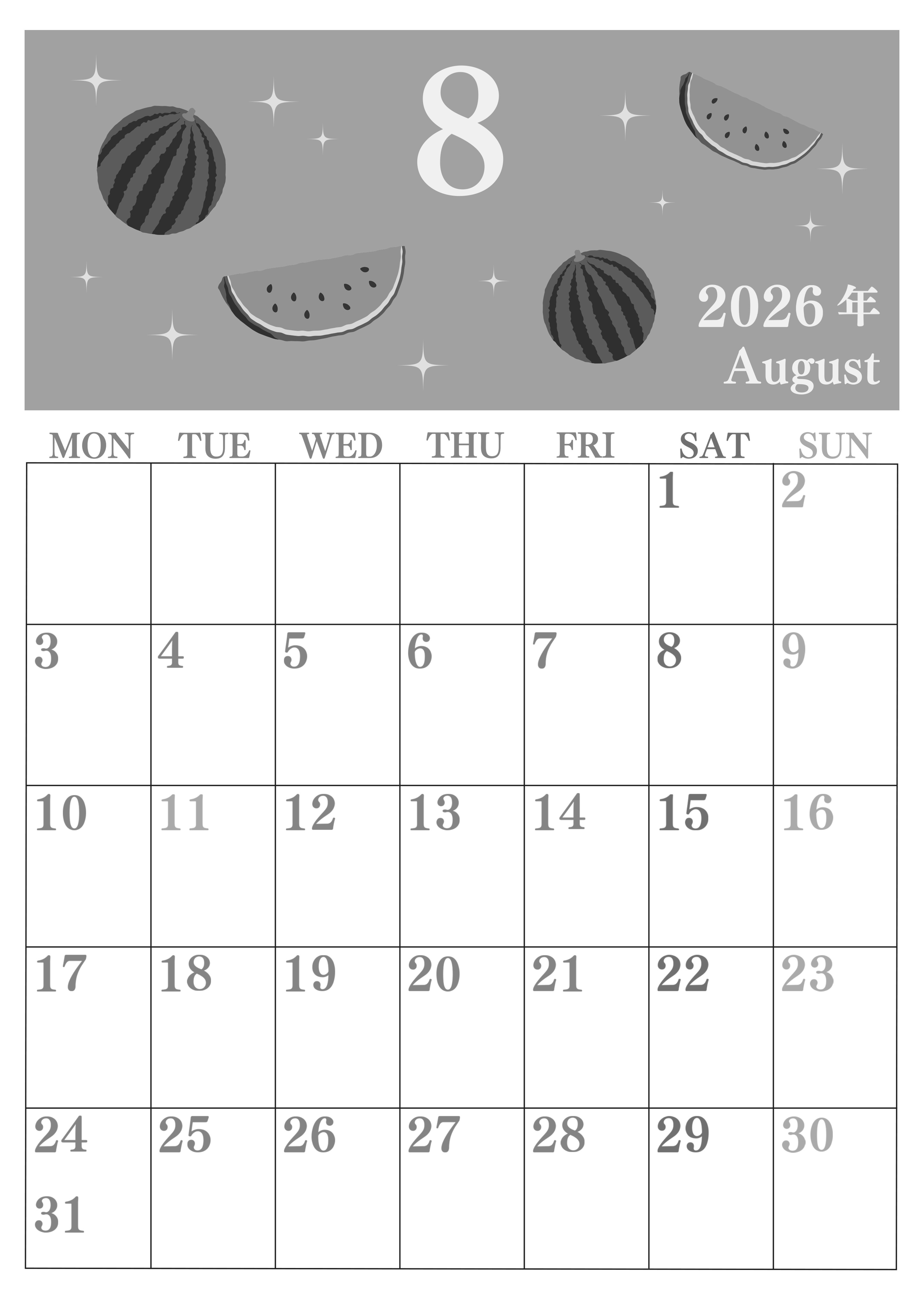 2026年8月縦型モノクロの月曜始まりの無料テンプレート白黒カレンダーです。まん丸でおいしそうな西瓜のイラストがかわいい夏真っ只中な雰囲気が伝わってくる月曜始まりタイプの無料白黒カレンダーを用意しました。(2026-00440811)