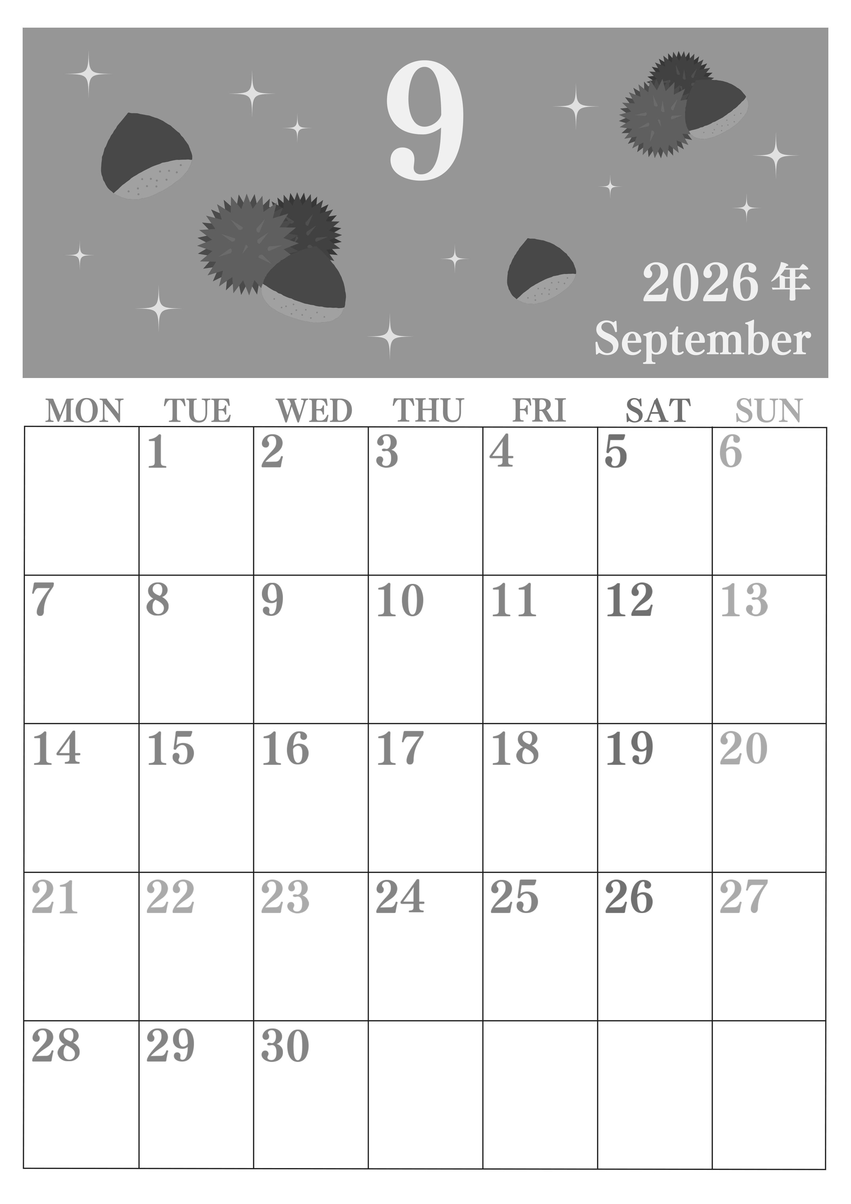 2026年9月縦型モノクロの月曜始まりの無料テンプレート白黒カレンダーです。栗をテーマにしているかわいいイラスト付き。秋はたくさんのおいしいものを食べましょう。毎日充実させるための月曜始まり白黒カレンダーです。(2026-00440911)