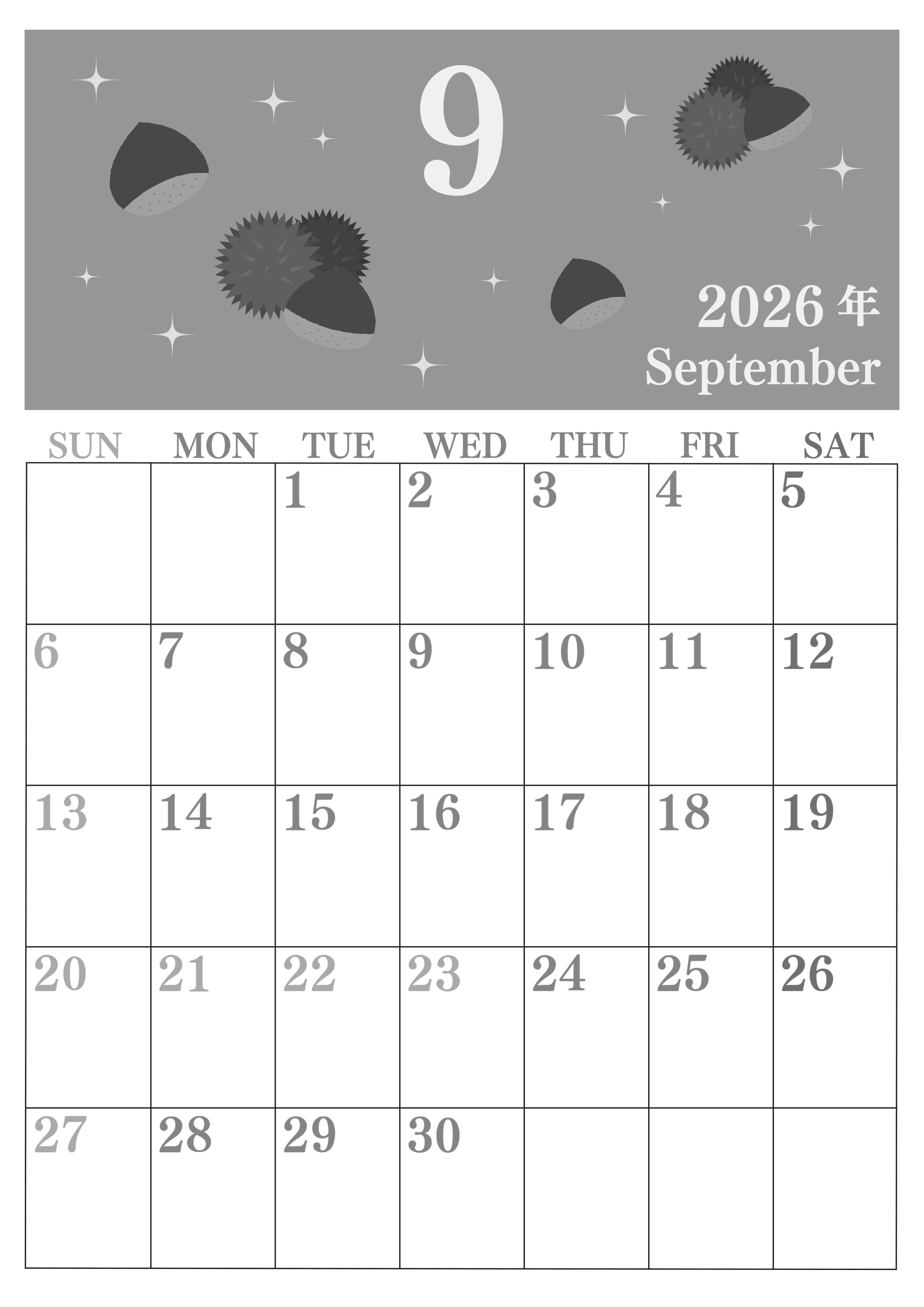 2026年9月縦型モノクロの日曜始まりの無料テンプレート白黒カレンダーです。大人っぽい背景色に栗のイラストがとても映えているかわいい世界観のフリー素材となっています。罫線も引かれているので実用的です。(2026-00440910)