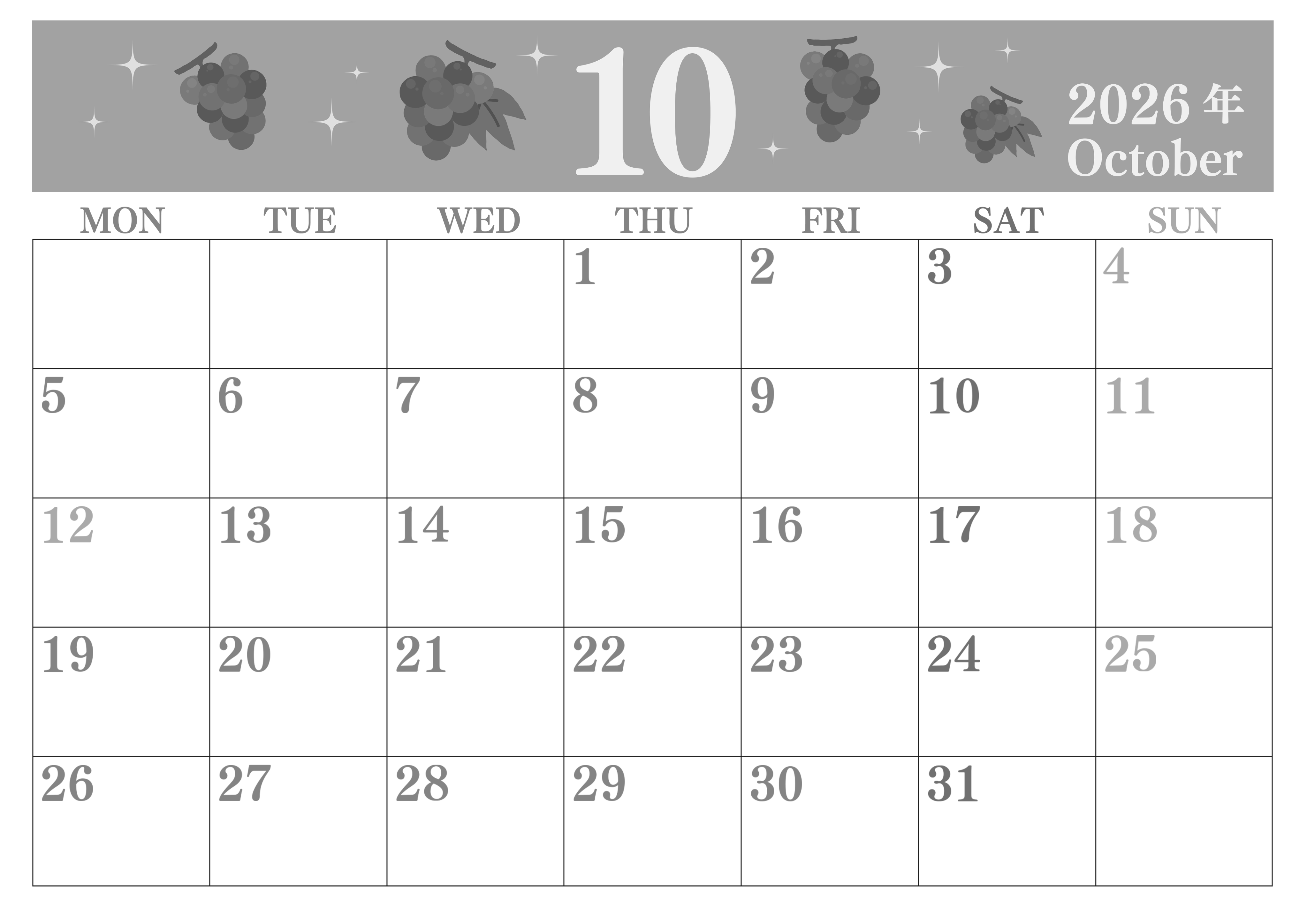 2026年10月横型モノクロの月曜始まりの無料テンプレート白黒カレンダーです。フルーツのイラストが目を引くかわいいフリー素材です。月曜始まりで予定を書き込むのにとても向いているのでダウンロードしましょう。(2026-00441001)