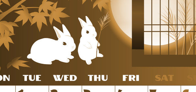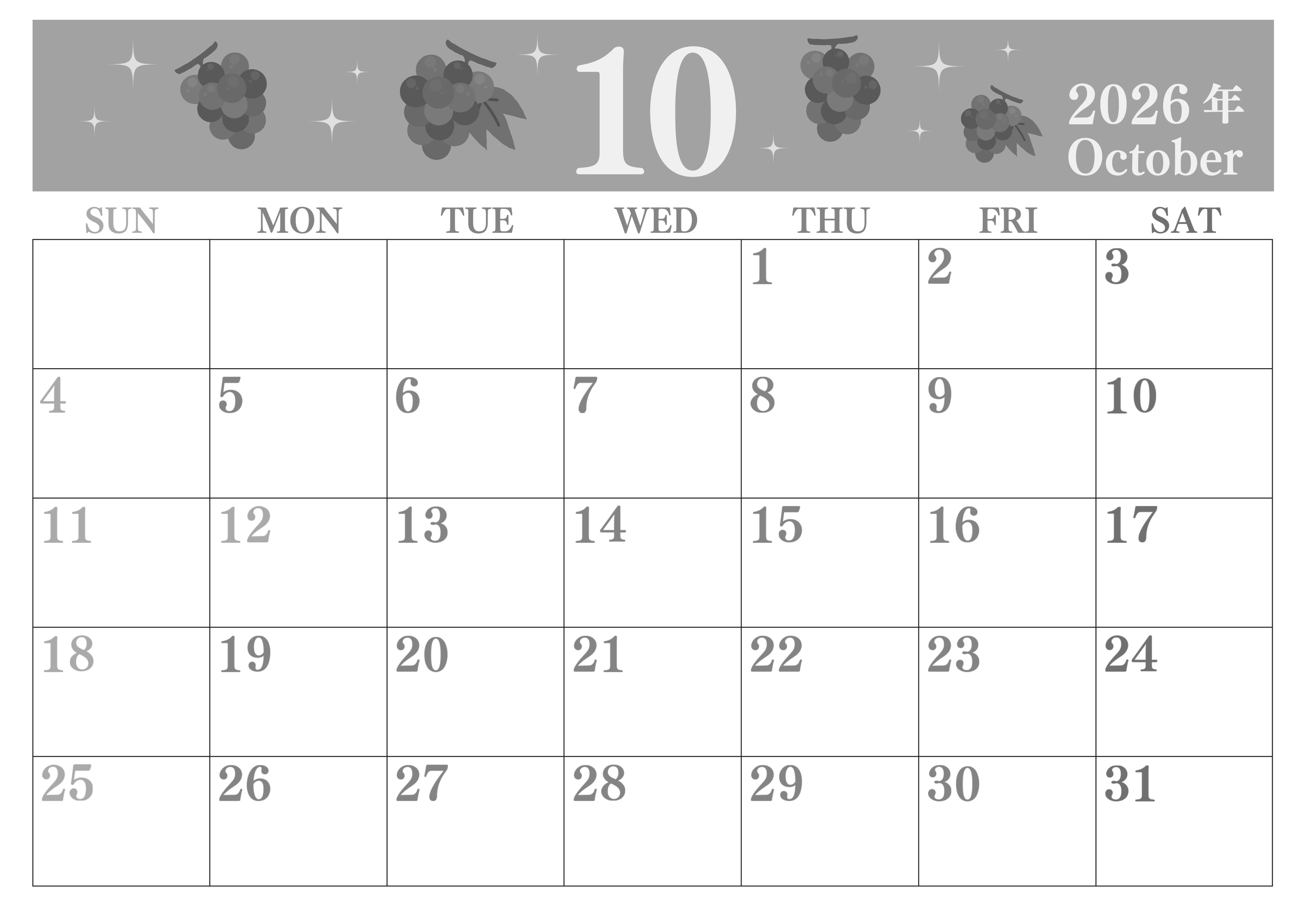 2026年10月横型モノクロの日曜始まりの無料テンプレート白黒カレンダーです。背景にフルーツのイラストが配置されているかわいいテイストです。曜日によって文字フォントの色を変えているので見やすいです。(2026-00441000)