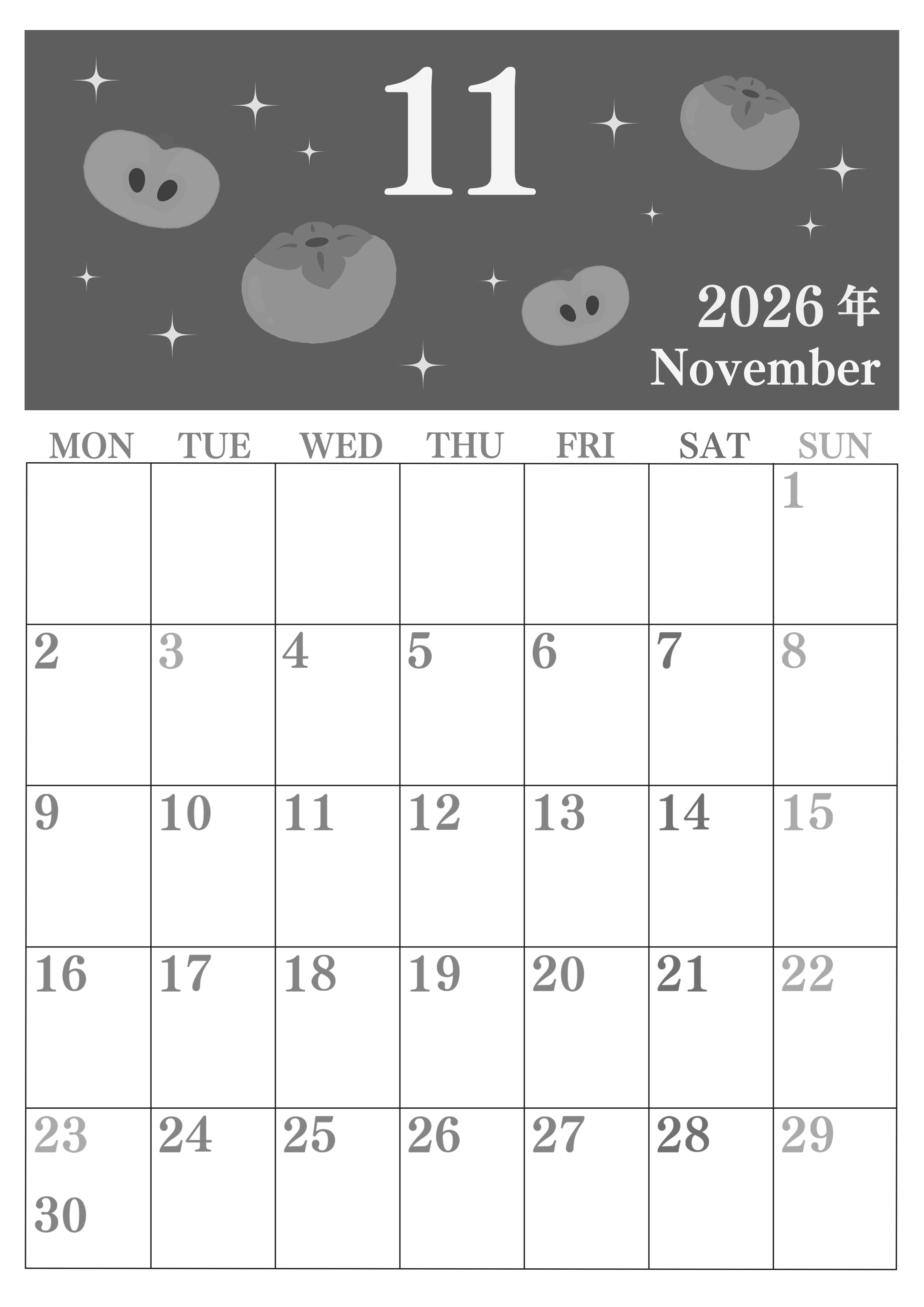 2026年・無料のカレンダーテンプレート 2026年11月縦型モノクロの月曜始まり 柿イラストのかわいいA4無料白黒カレンダー(2026-00441111) 素材状デザイン王 2025年4月1日 2026年11月縦型モノクロの月曜始まりの無料テンプレート白黒カレンダーです。はっきりとしていてかわいいです。イラストだけでなく白黒カレンダーの余白もたっぷりしているので実用性が高いです。(2026-00441111) 11月 縦型のカレンダー 月曜始まり 白黒 カレンダーデザイン-0044