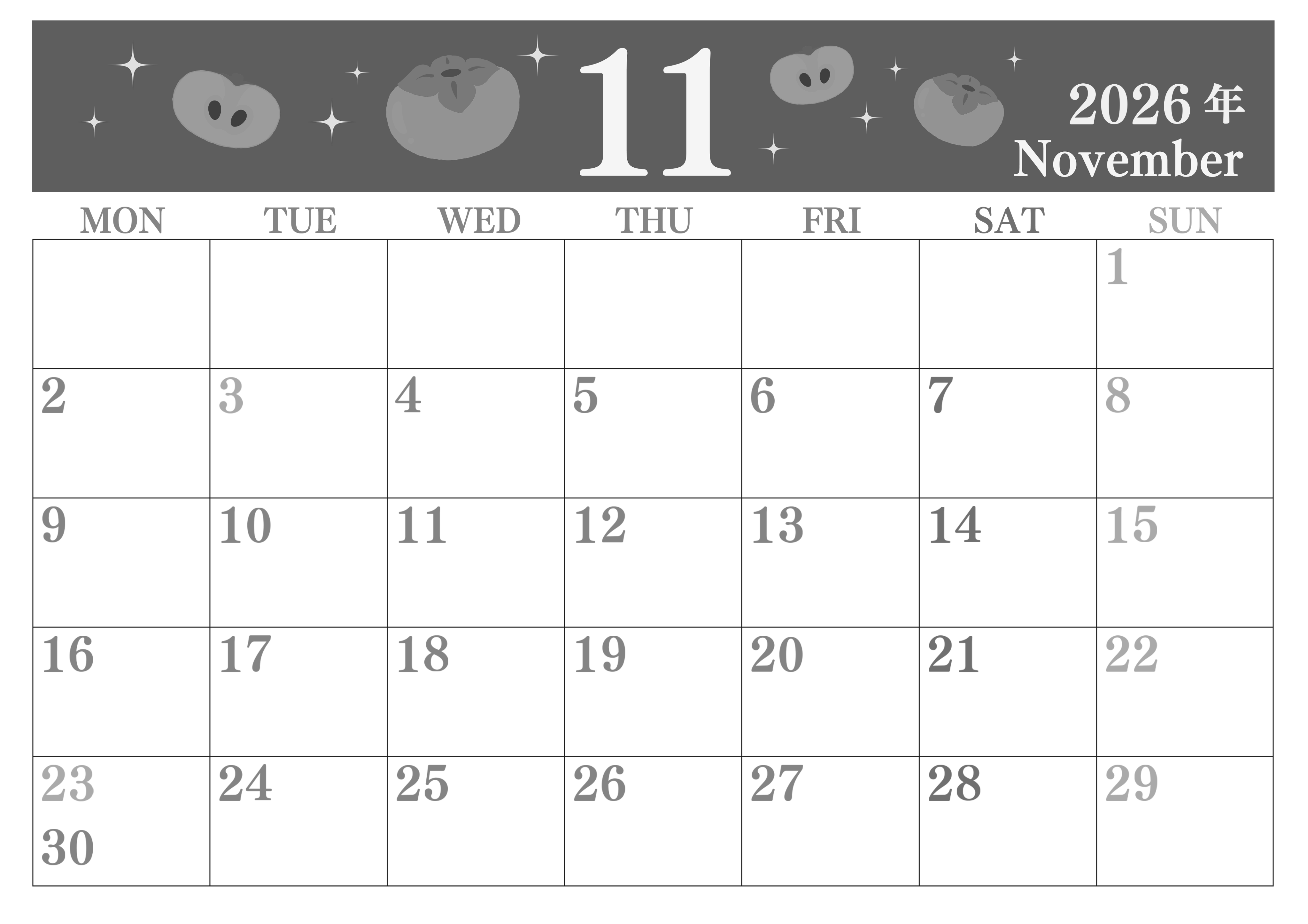 2026年11月横型モノクロの月曜始まり 柿イラストのかわいいA4無料白黒カレンダー(2026-00441101)