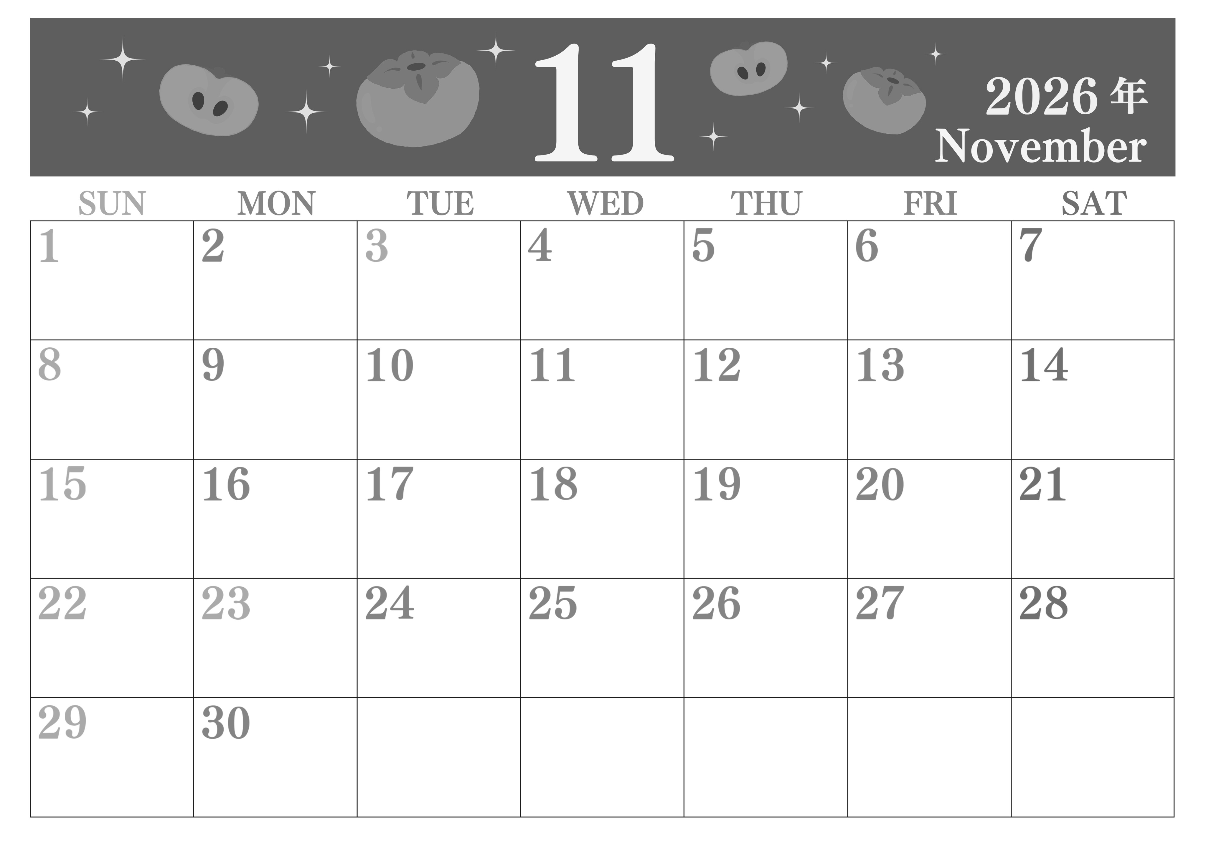 2026年11月横型モノクロの日曜始まり 柿イラストのかわいいA4無料白黒カレンダー(2026-00441100)