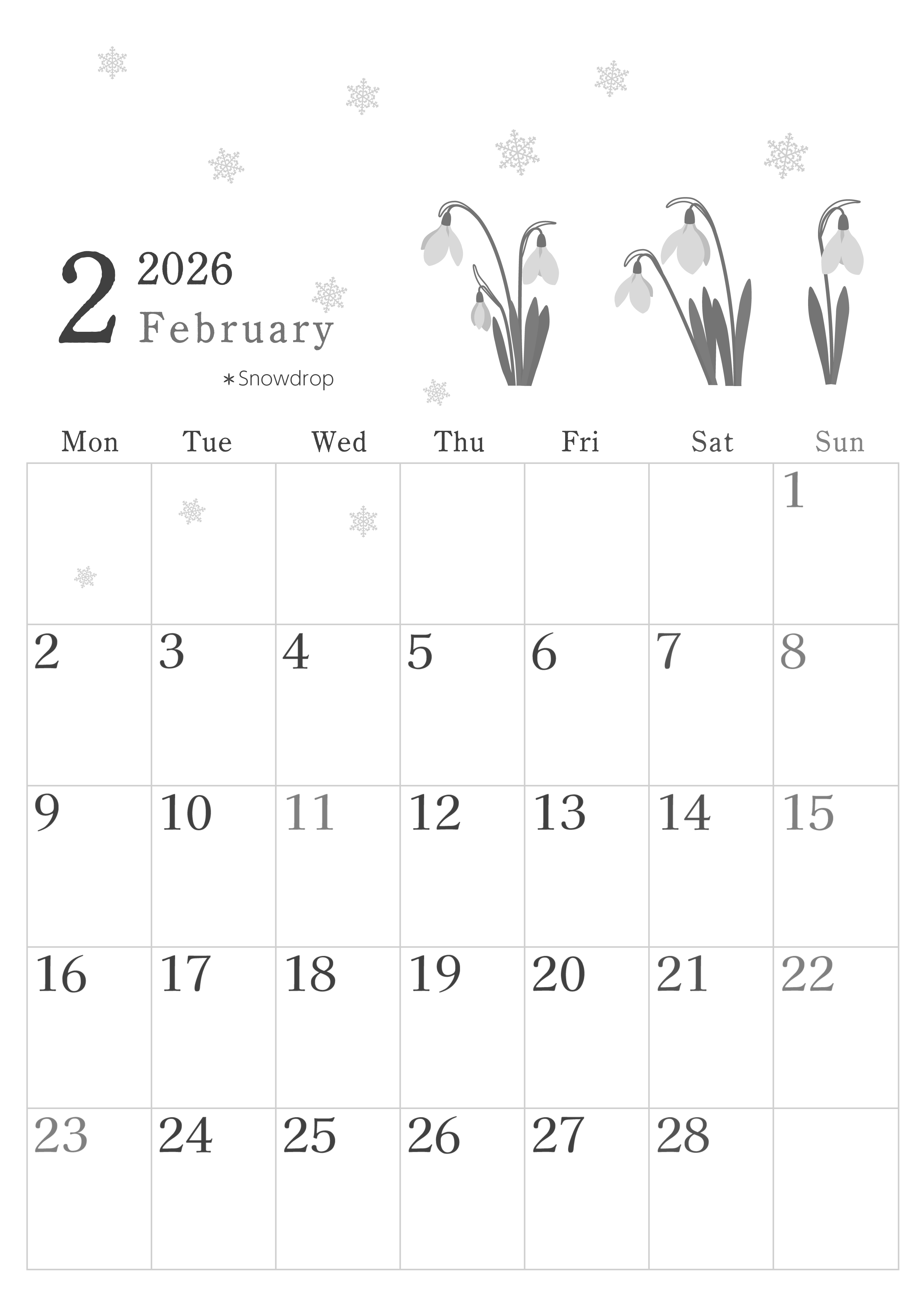 2026年2月縦型モノクロの月曜始まり白黒カレンダーです。スノードロップという花は冬に咲くヒガンバナの仲間であるおしゃれな植物です。フリー素材で曜日によって色分けしたデザインが使いやすいイラスト付き白黒カレンダーは月曜始まりです。(2026-00450211)