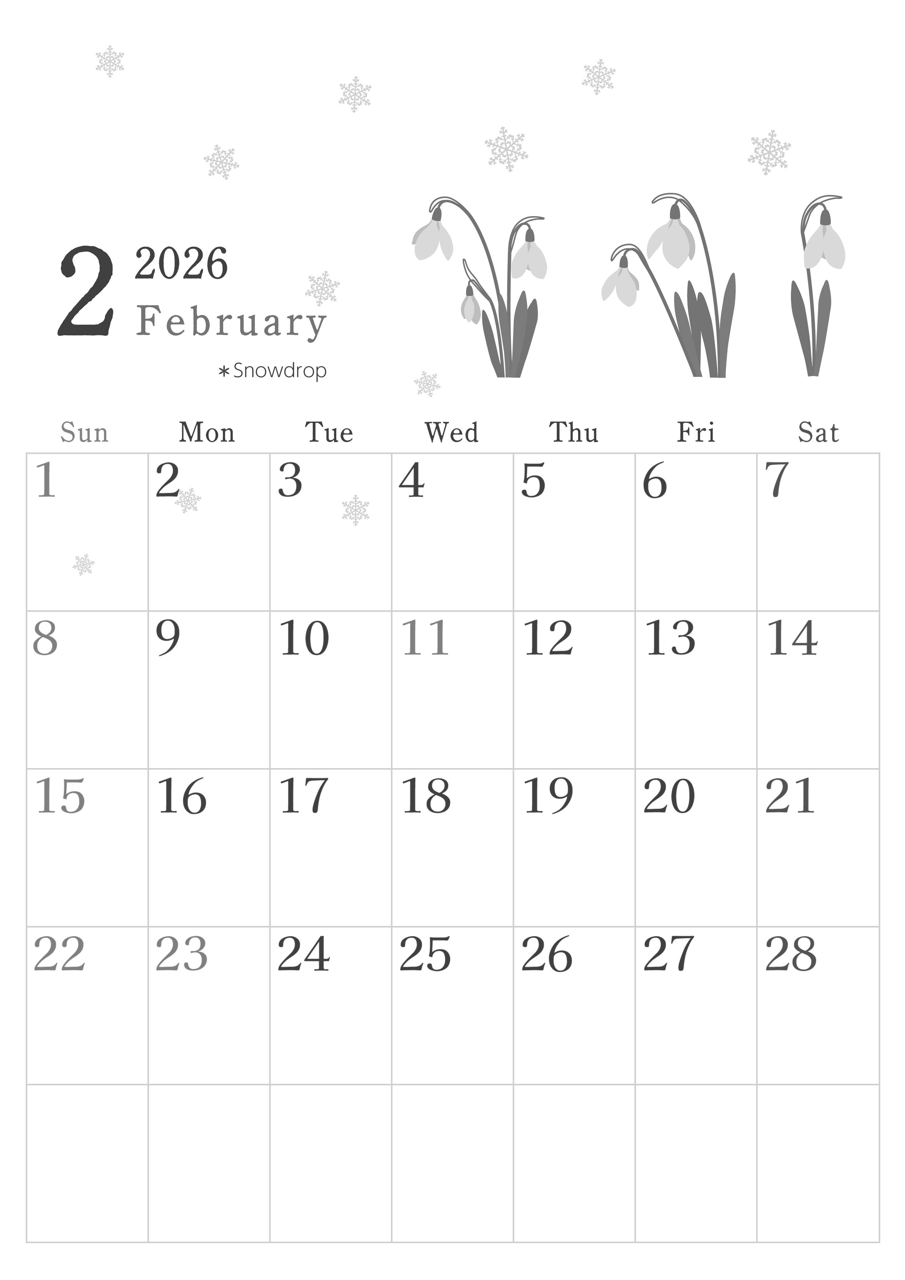 2026年2月縦型モノクロの日曜始まり白黒カレンダーです。スノードロップの草花が大人かわいいを演出しているおしゃれな白黒カレンダー素材です。フリーでありながらもイラストがしっかり描かれているデザインとなっています。(2026-00450210)