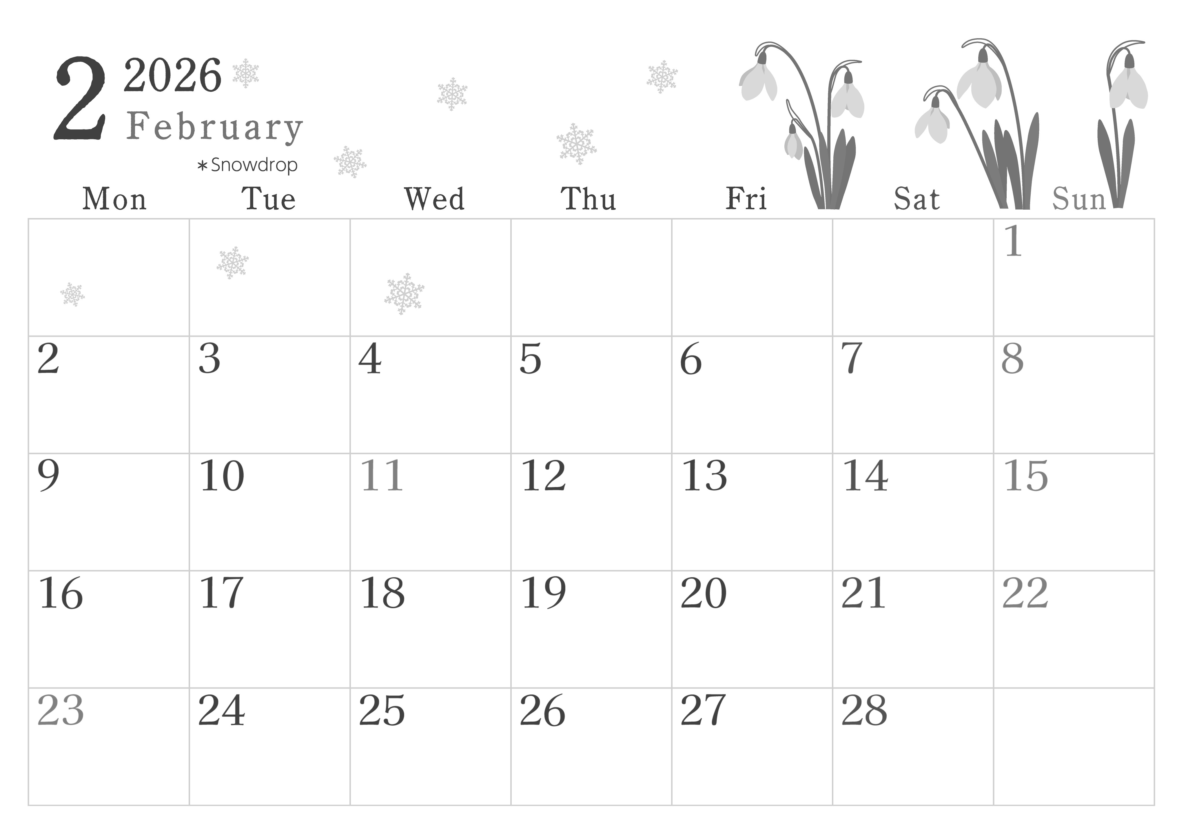 2026年2月横型モノクロの月曜始まり白黒カレンダーです。スノードロップの花が頭を垂れているイラストが大人っぽくておしゃれかわいい月曜始まりの白黒カレンダーです。スケジュールを書き込みできる欄が広いので忙しい人にぴったりです。(2026-00450201)
