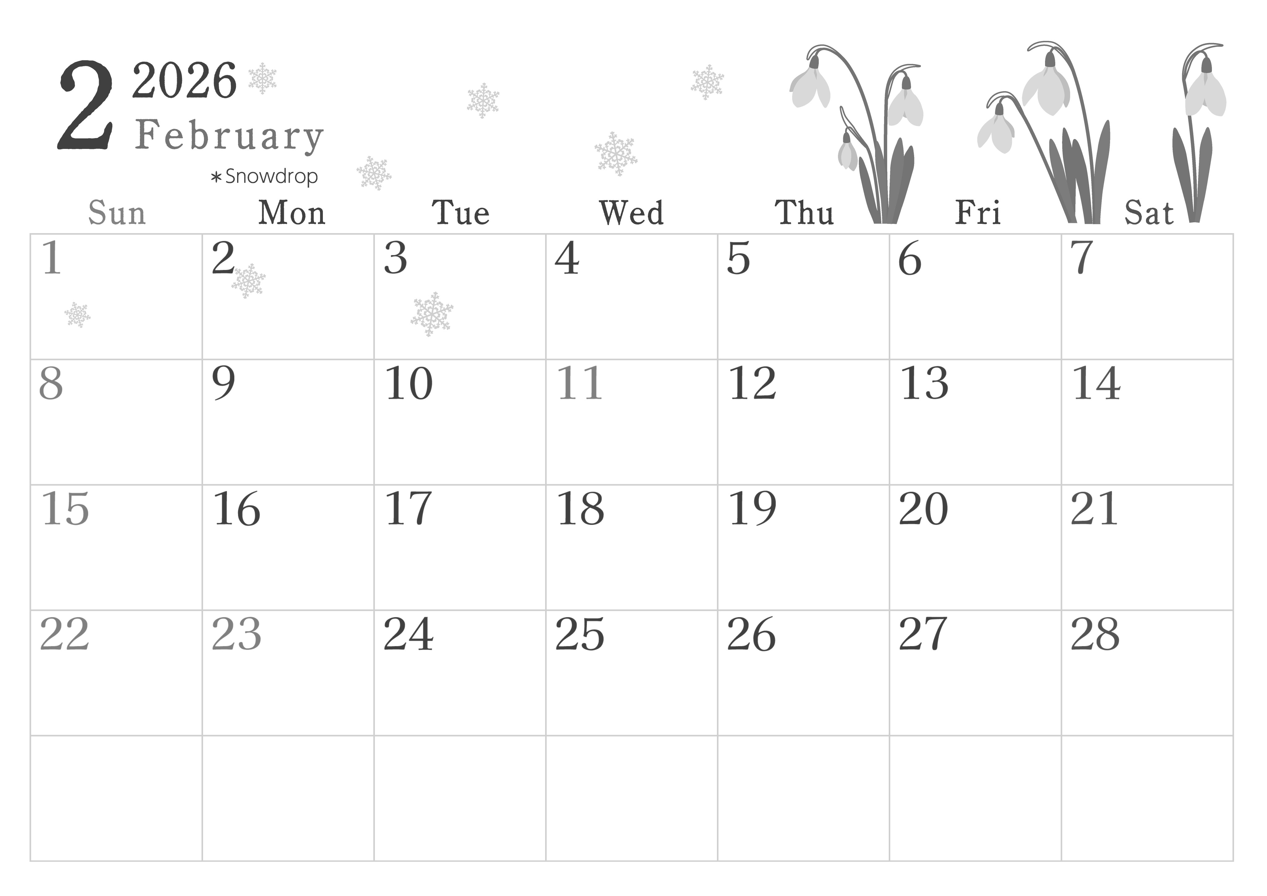 2026年2月横型モノクロの日曜始まり白黒カレンダーです。スノードロップの白い花が上品に佇んでいるおしゃれかわいいテンプレート白黒カレンダーです。白紙ベースなのでプリンタのインク節約にもなるイラストです。(2026-00450200)