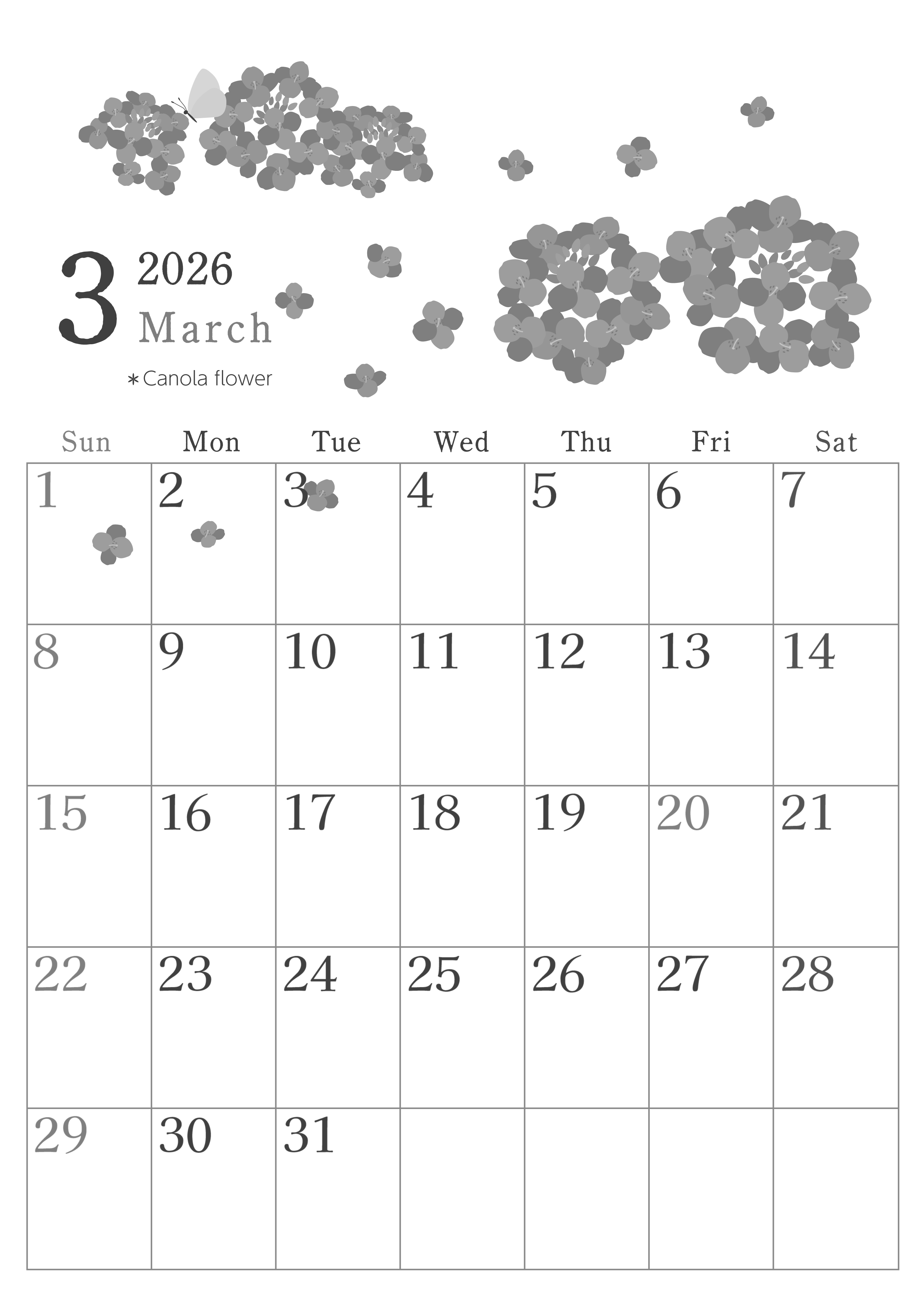 2026年3月縦型モノクロの日曜始まり 菜の花イラストのかわいいA4無料白黒カレンダー(2026-00450310)