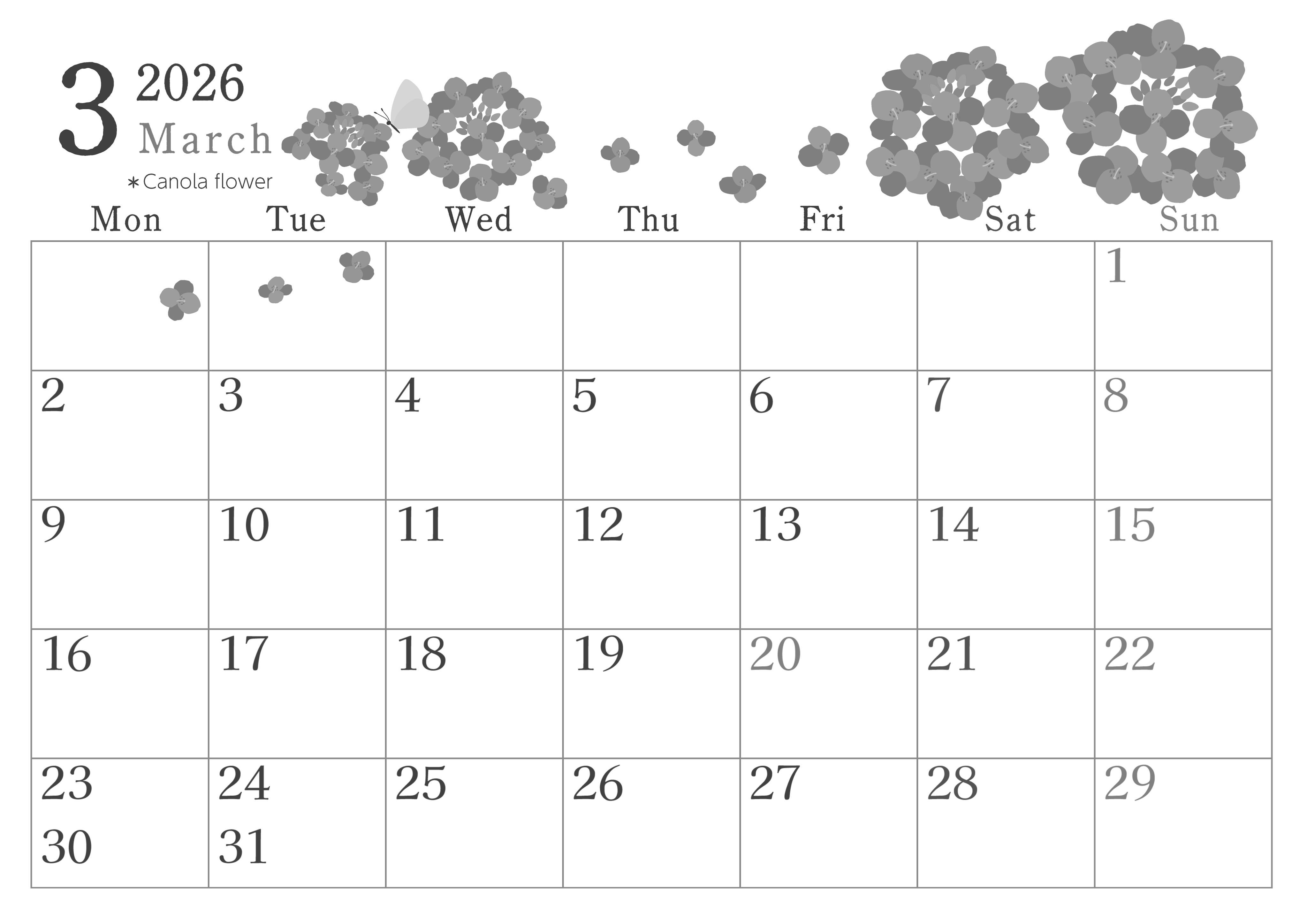 2026年・無料のカレンダーテンプレート 2026年3月横型モノクロの月曜始まり 菜の花イラストのかわいいA4無料白黒カレンダー(2026-00450301) 素材状デザイン王 2025年4月1日 2026年3月横型モノクロの月曜始まりの無料テンプレート白黒カレンダーです。菜の花イラストが目を引く月曜始まりで曜日ごとに文字の色分けがされている使い勝手の良い白黒カレンダーです。(2026-00450301) 3月 横型のカレンダー 月曜始まり 白黒 カレンダーデザイン-0045