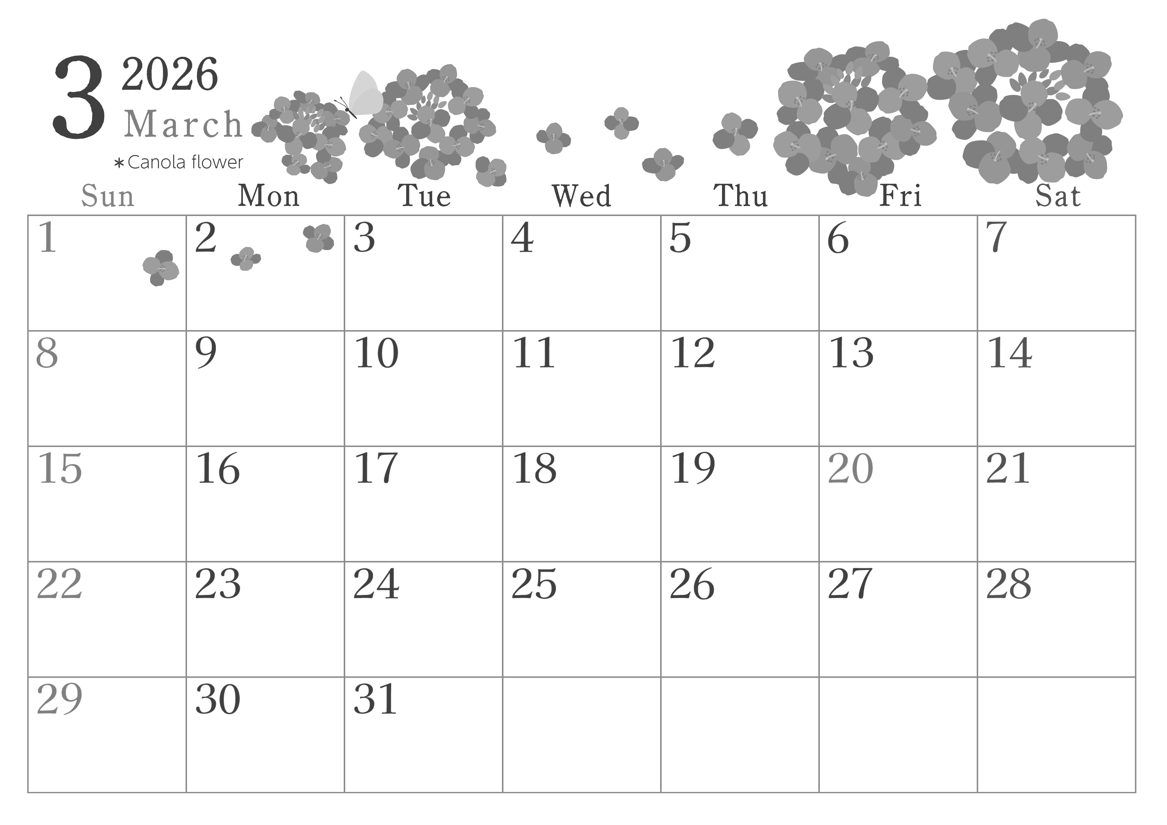 2026年・無料のカレンダーテンプレート 2026年3月横型モノクロの日曜始まり 菜の花イラストのかわいいA4無料白黒カレンダー(2026-00450300) 素材状デザイン王 2025年4月1日 2026年3月横型モノクロの日曜始まりの無料テンプレート白黒カレンダーです。菜の花イラストが目を引くかわいい横型白黒カレンダーです。罫線がくっきりと引かれているので計画を立てやすいです。(2026-00450300) 3月 横型のカレンダー 日曜始まり 白黒 カレンダーデザイン-0045