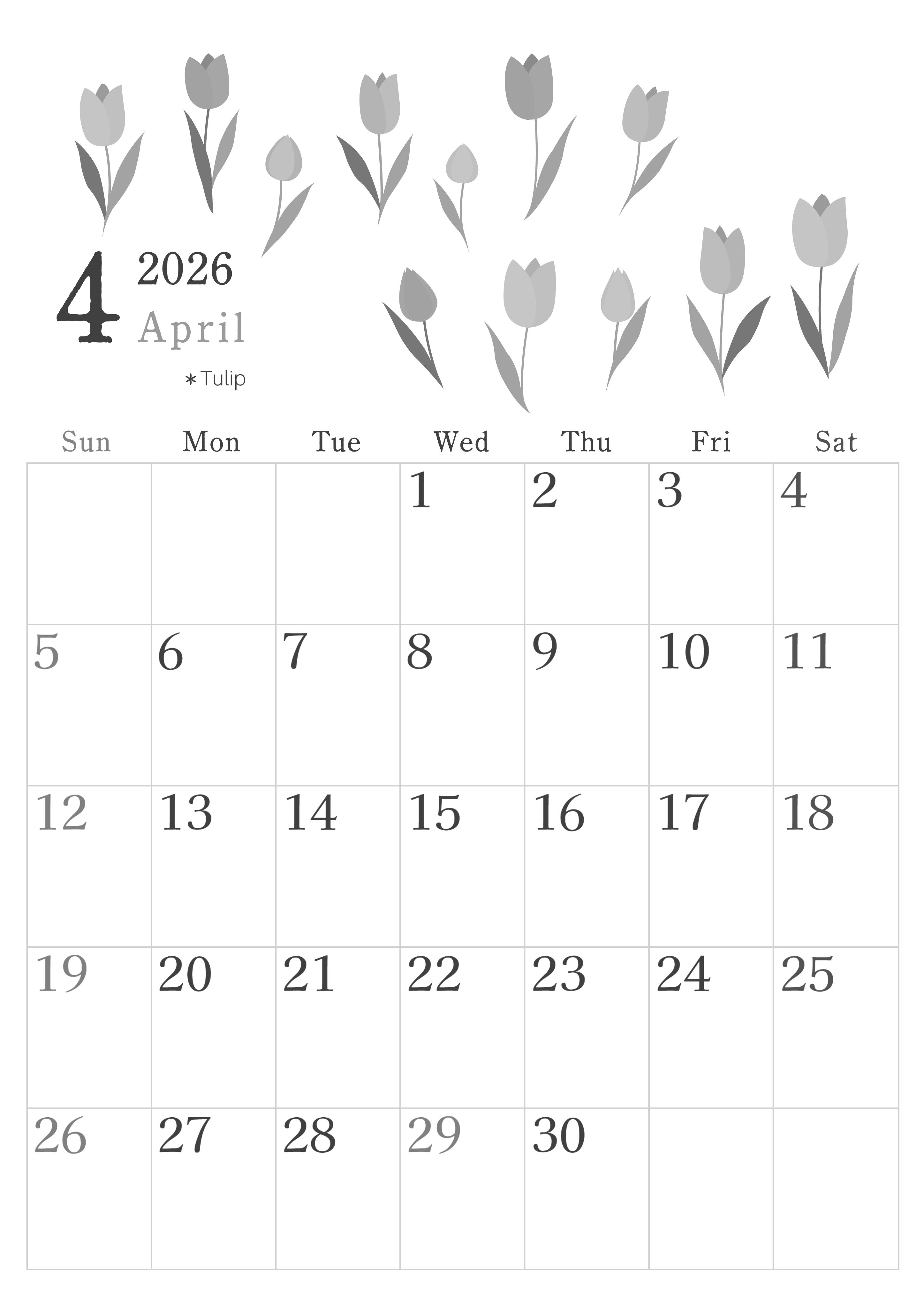 2026年4月縦型モノクロの日曜始まりの無料テンプレート白黒カレンダーです。春のかわいいチューリップをテーマにしたイラスト白黒カレンダーです。白紙に印刷をしても使うインクが少ないのでエコです。罫線ははっきりしているので書き込み利用に適しています。(2026-00450410)