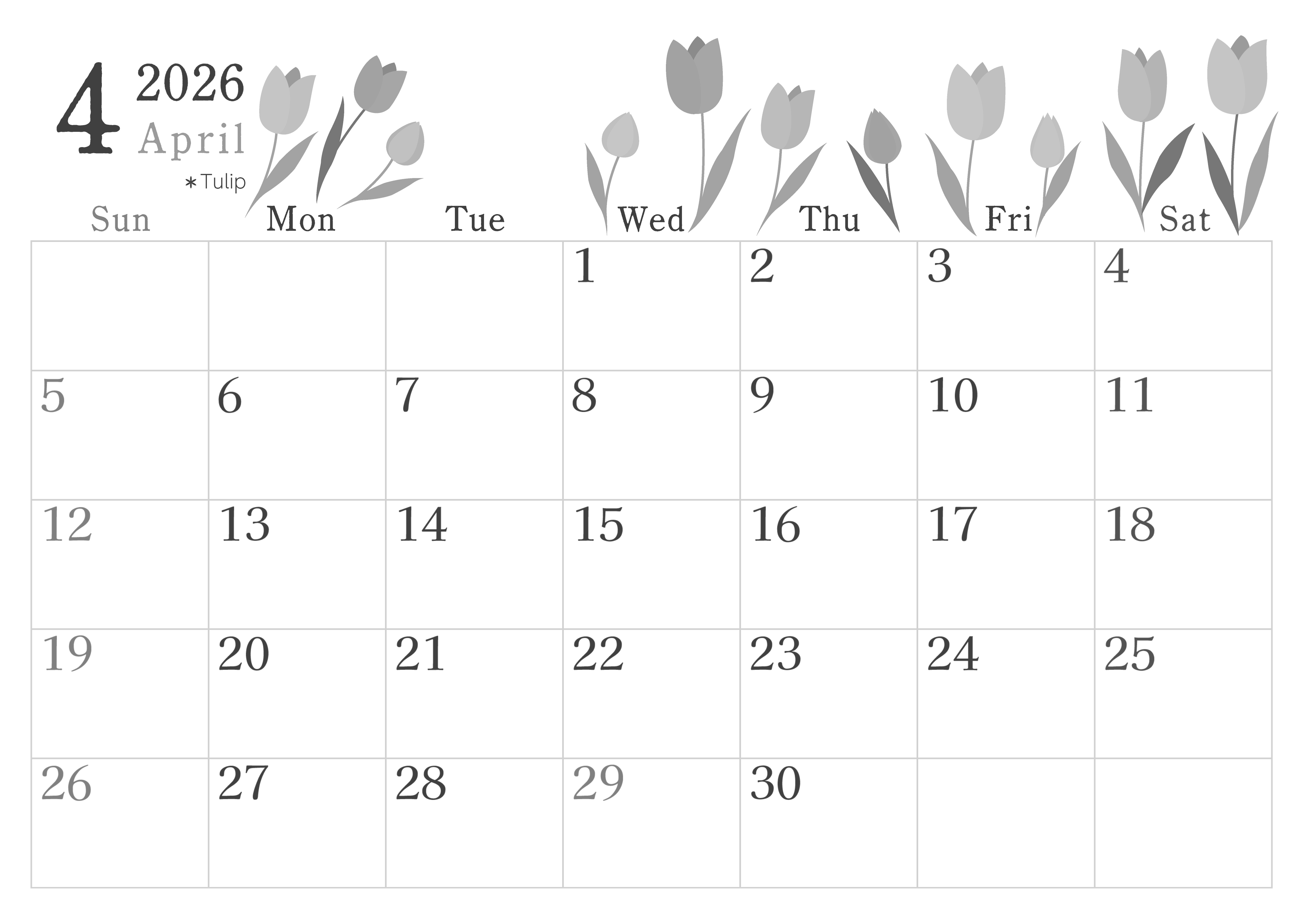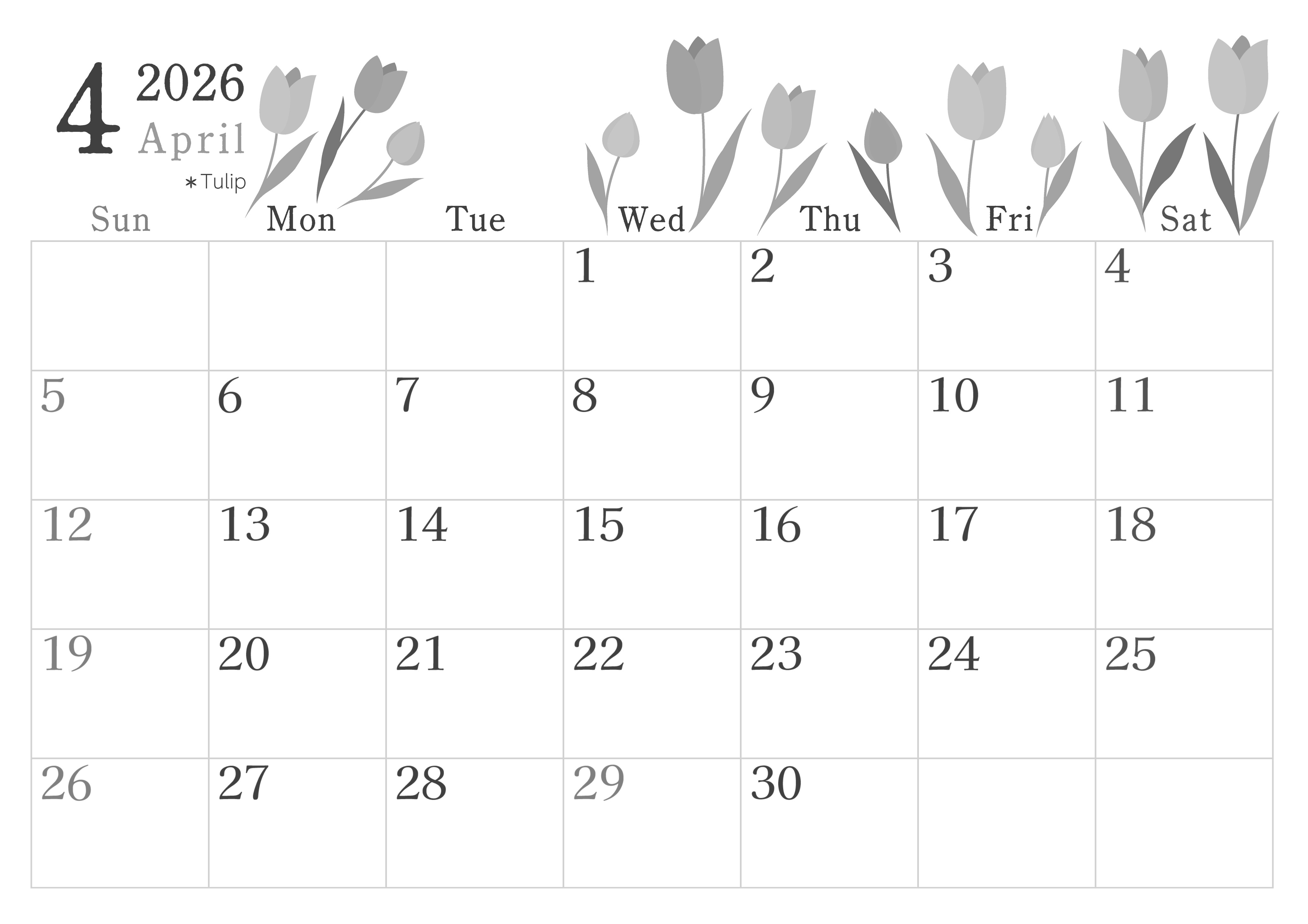2026年・無料のカレンダーテンプレート 2026年4月横型モノクロの日曜始まり チューリップがかわいいイラストA4無料白黒カレンダー(2026-00450400) 素材状デザイン王 2025年4月1日 2026年4月横型モノクロの日曜始まりの無料テンプレート白黒カレンダーです。それぞれのアイデンティティが光るようなチューリップのイラストがシンプルでかわいい日曜始まりの白黒カレンダーです。(2026-00450400) 4月 横型のカレンダー 日曜始まり 白黒 カレンダーデザイン-0045