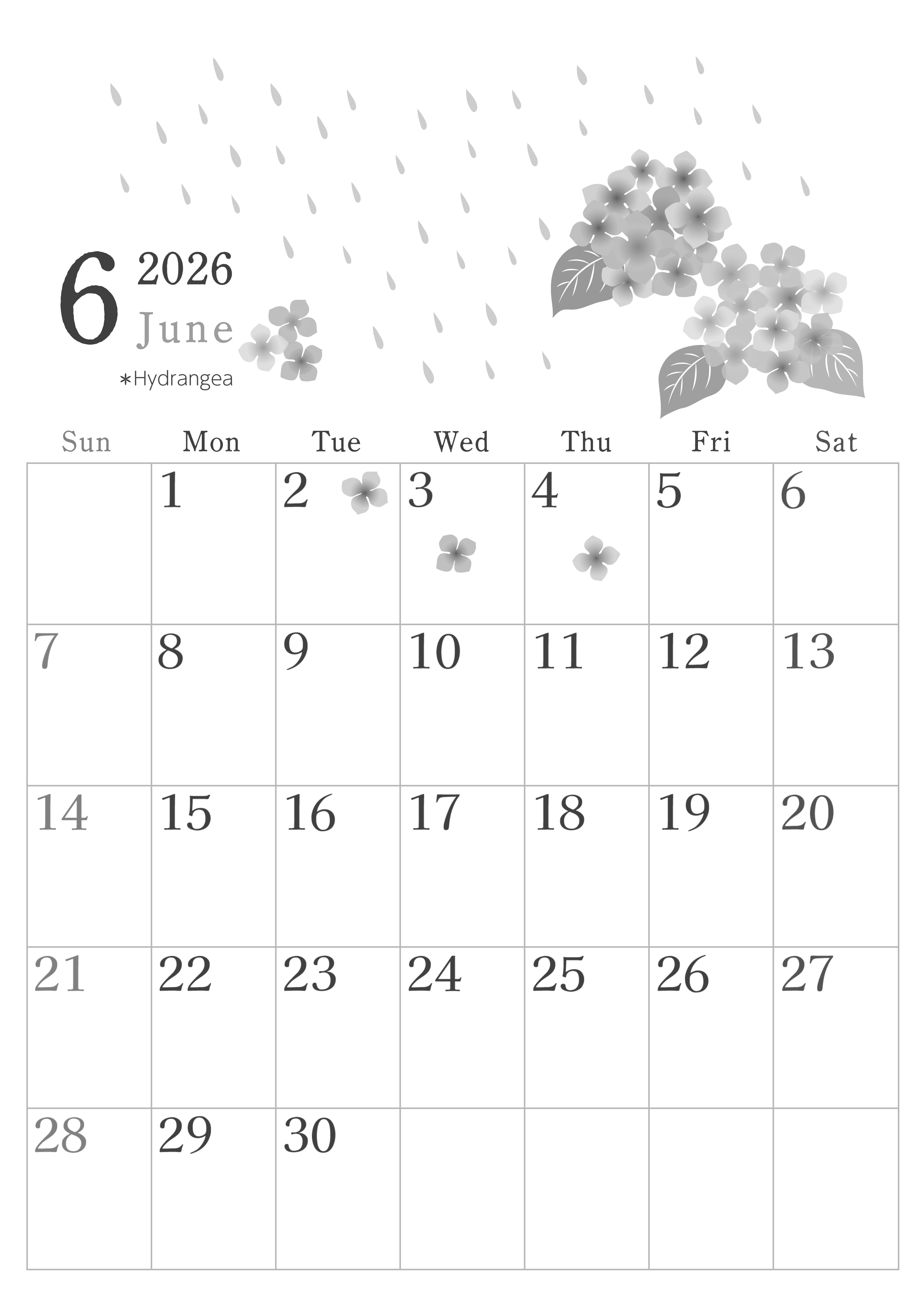 2026年6月縦型モノクロの日曜始まり 梅雨の季節イラストのかわいいA4無料白黒カレンダー(2026-00450610)
