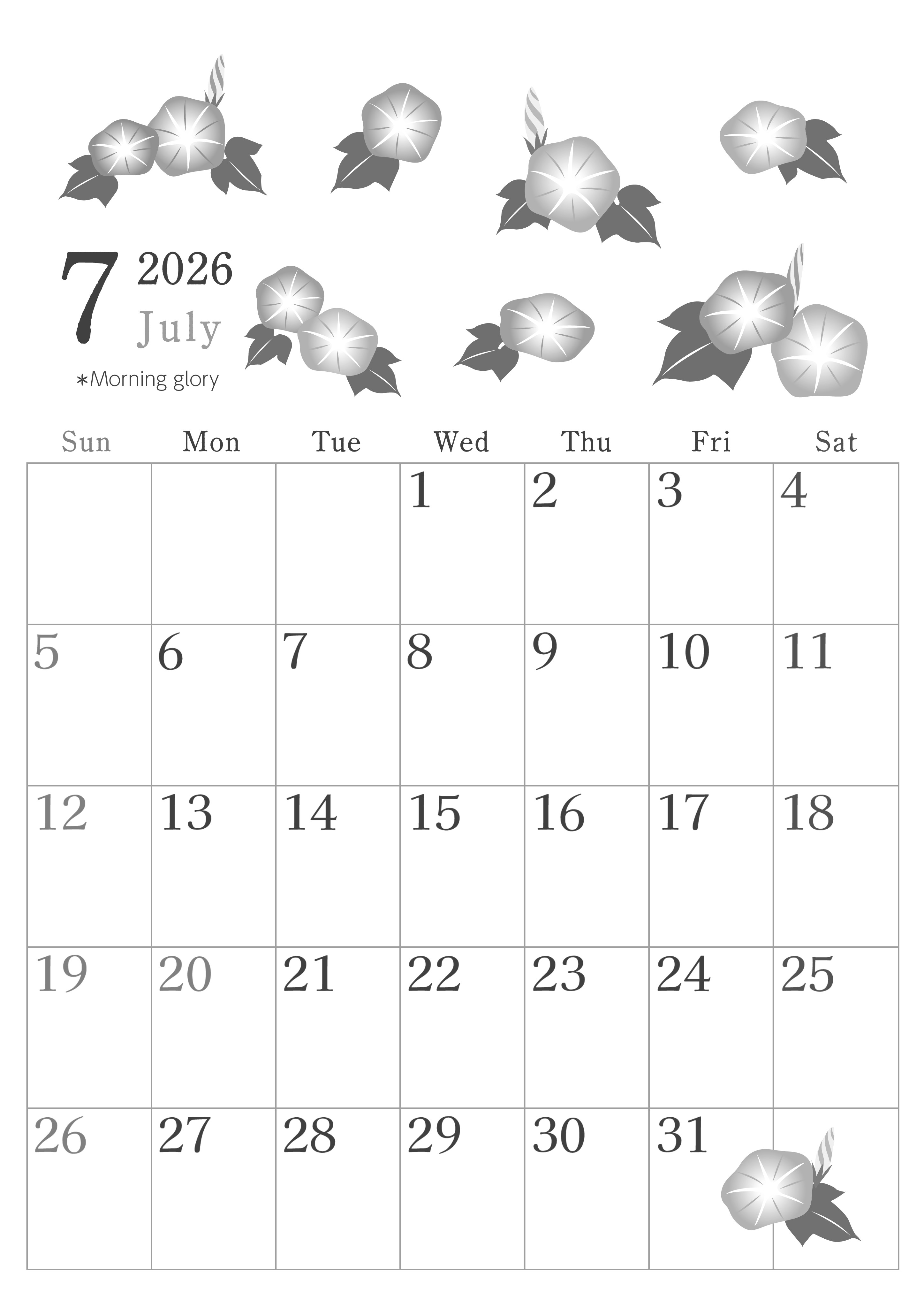 2026年7月縦型モノクロの日曜始まりの無料テンプレート白黒カレンダーです。目立ちすぎないようなテイストで描かれている季節の花が白黒カレンダーに花を持たせてくれているかわいいしっとりとしたイラストフリー素材です。(2026-00450710)