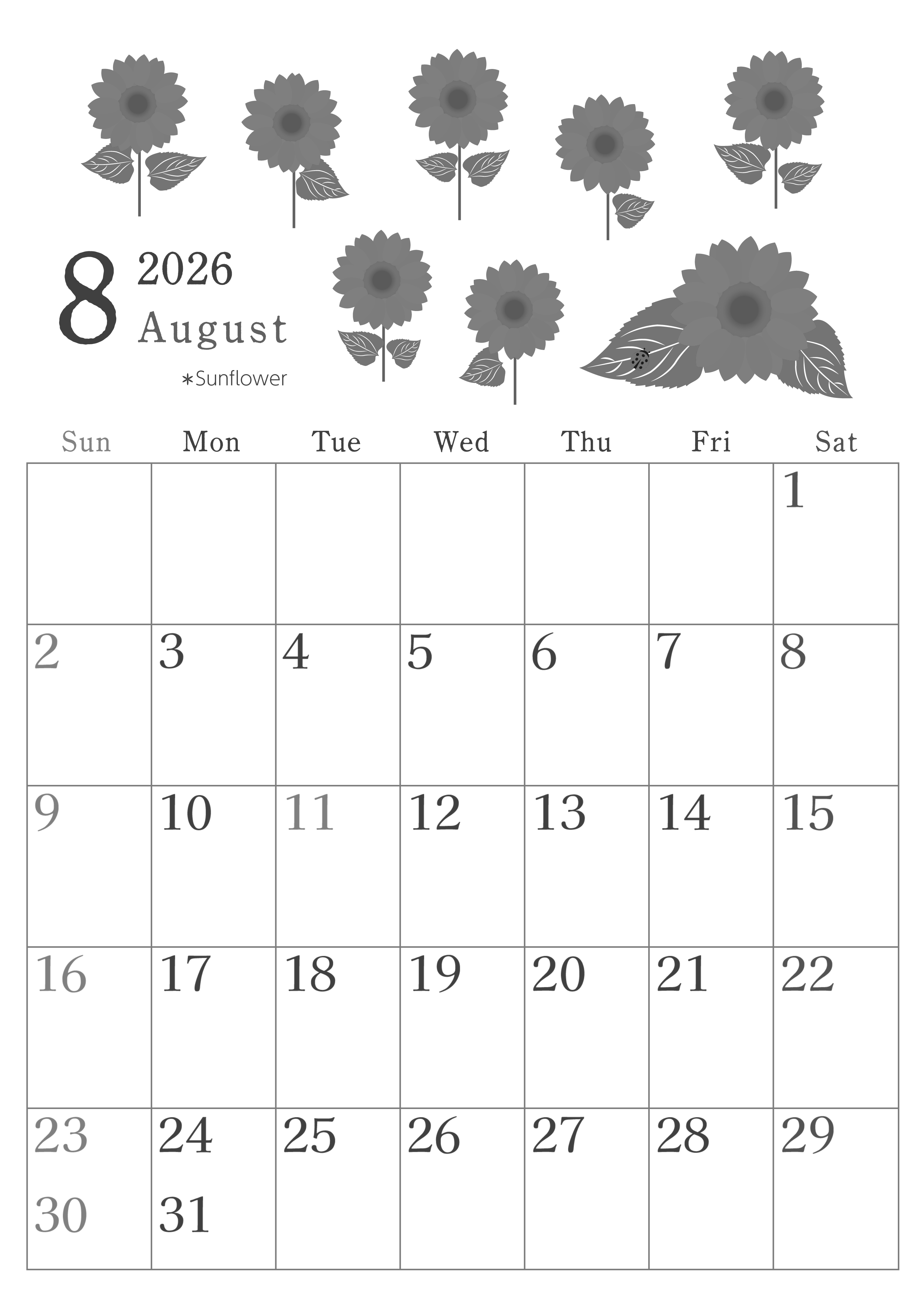 2026年8月縦型モノクロの日曜始まり 夏の花のイラストがかわいいA4無料白黒カレンダー(2026-00450810)