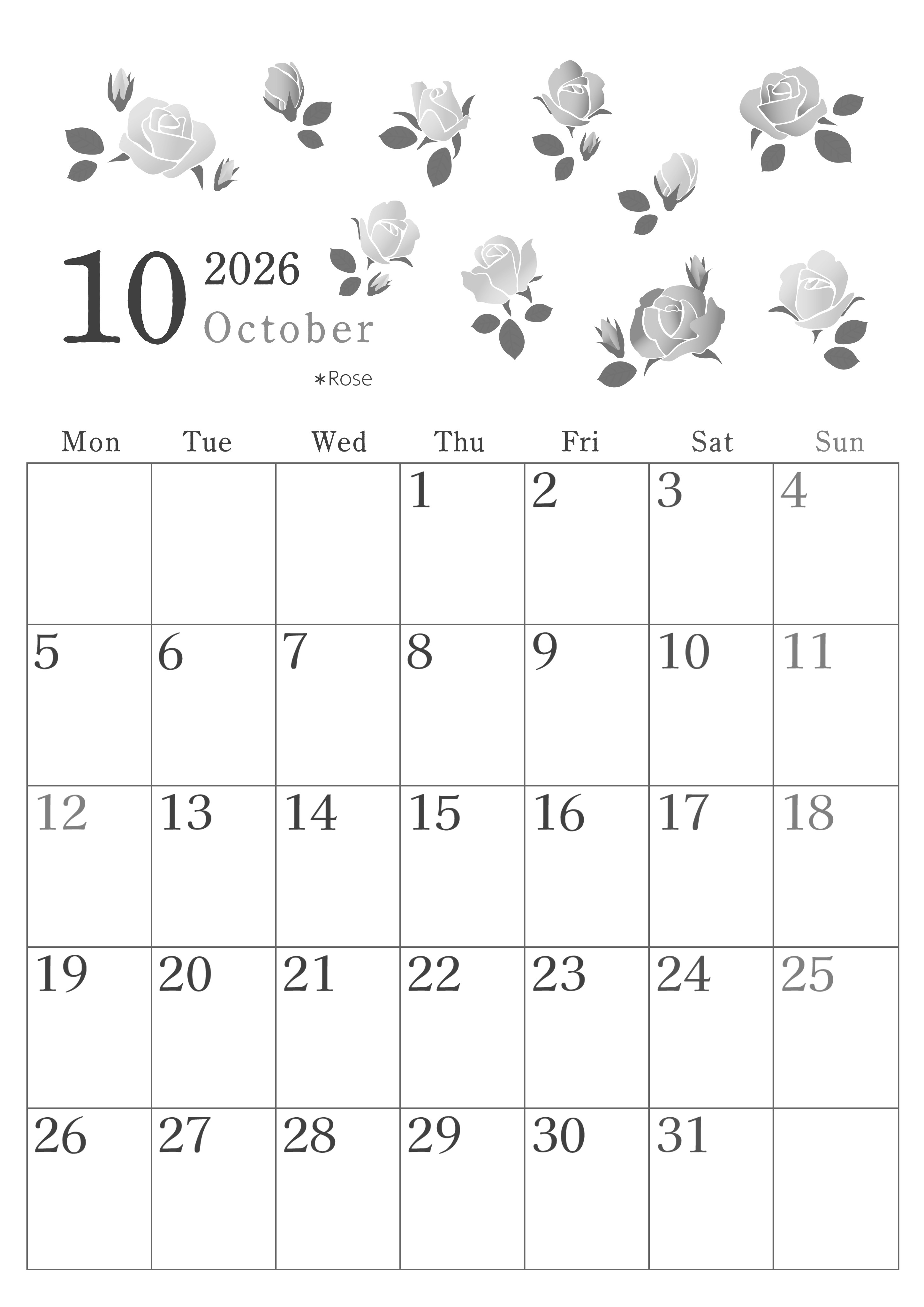 2026年10月縦型モノクロの月曜始まりの無料テンプレート白黒カレンダーです。月曜始まりタイプが好きな人におすすめです。イラスト部分に咲いているローズも大人かわいいです。曜日によって文字の色分けがされているので見やすいです。(2026-00451011)