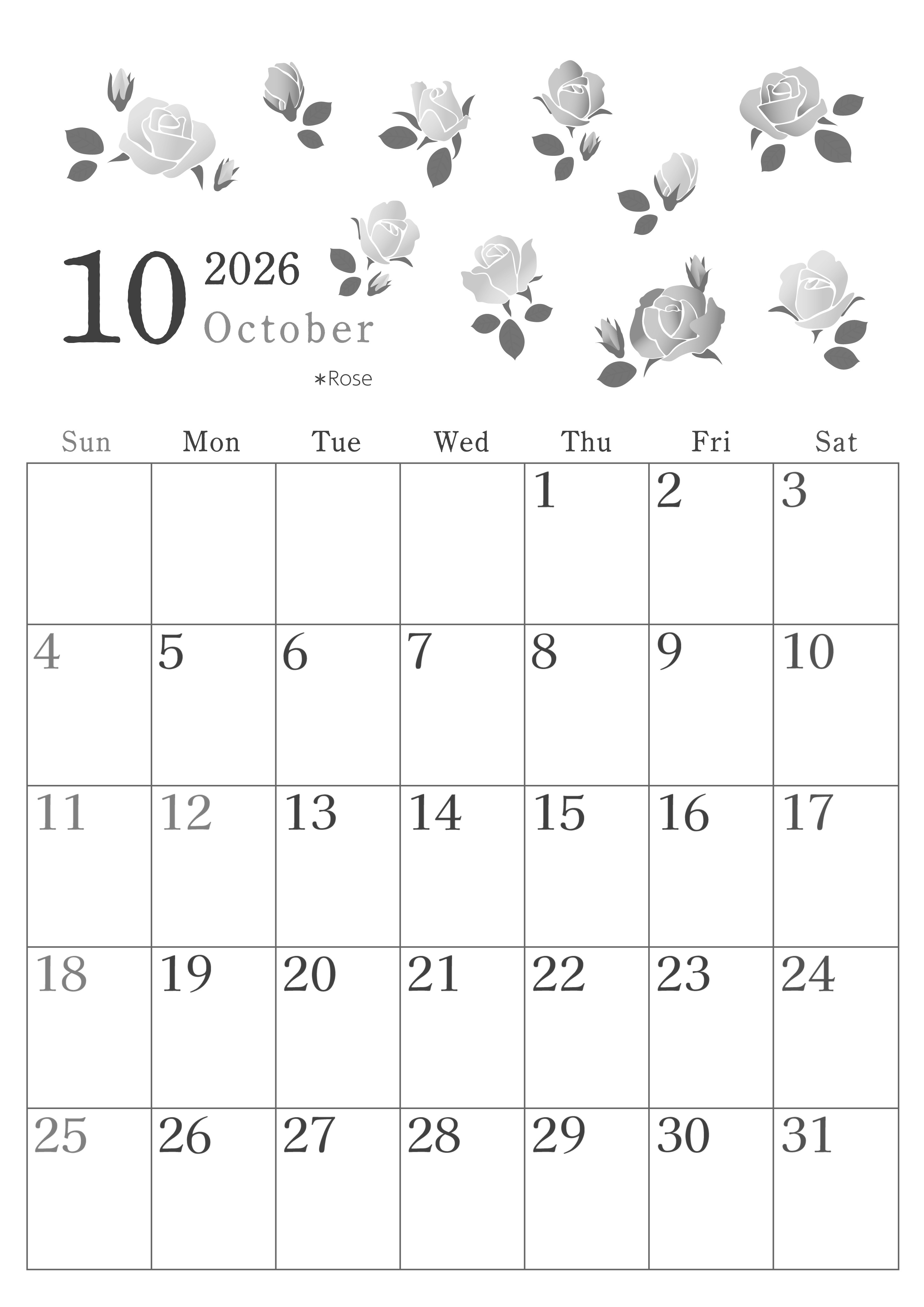 2026年・無料のカレンダーテンプレート 2026年10月縦型モノクロの日曜始まり ローズがかわいいイラストA4無料白黒カレンダー(2026-00451010) 素材状デザイン王 2025年4月1日 2026年10月縦型モノクロの日曜始まりの無料テンプレート白黒カレンダーです。ローズのイラストがかわいいです。素朴な雰囲気が全体的に広がっています。派手すぎないのでちょうどいいデザインです。(2026-00451010) 10月 縦型のカレンダー 日曜始まり 白黒 カレンダーデザイン-0045