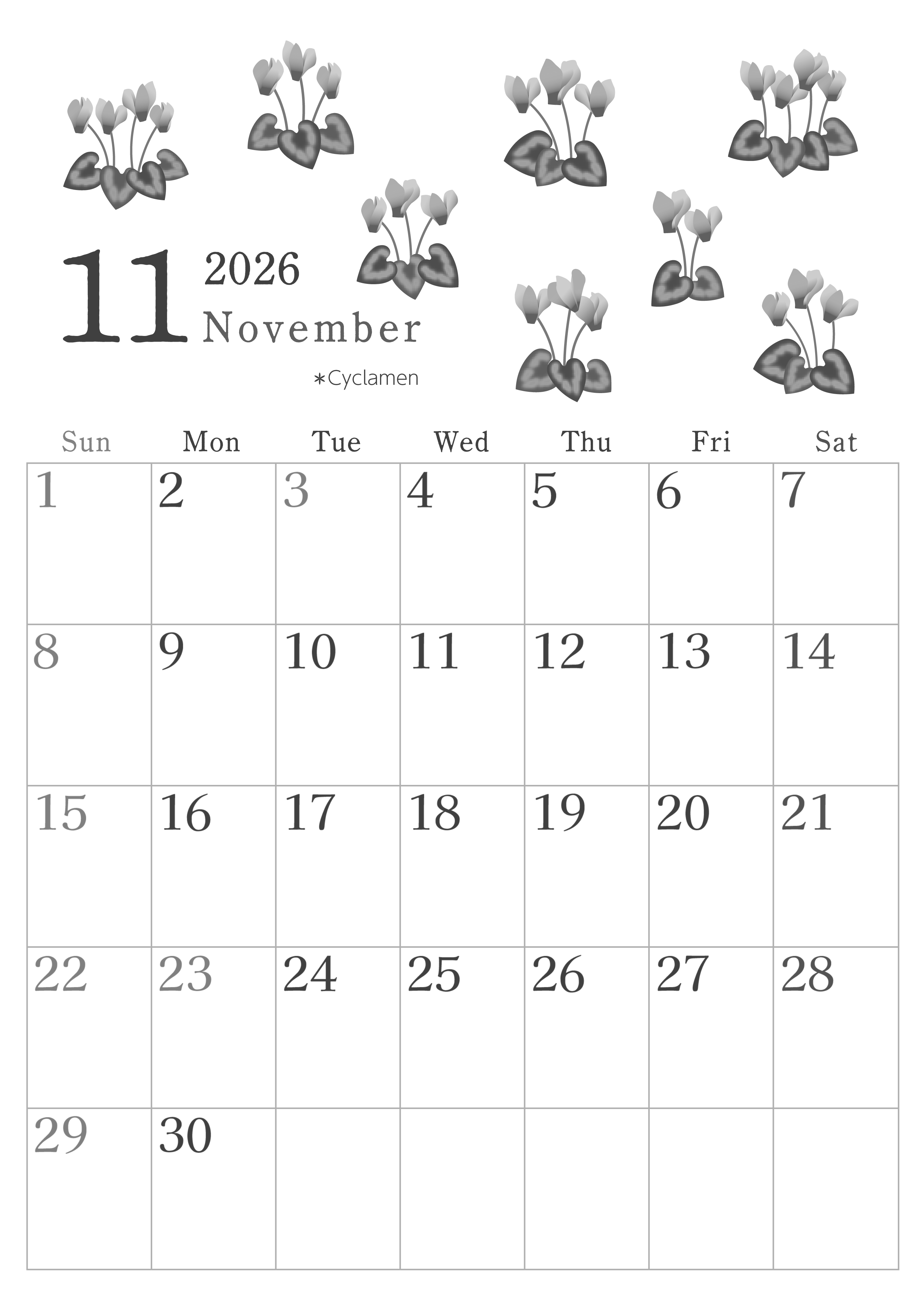 2026年・無料のカレンダーテンプレート 2026年11月縦型モノクロの日曜始まり シクラメンがかわいいイラストA4無料白黒カレンダー(2026-00451110) 素材状デザイン王 2025年4月1日 2026年11月縦型モノクロの日曜始まりの無料テンプレート白黒カレンダーです。シクラメンのイラストがかわいいです。素朴な雰囲気が全体的に広がっています。派手すぎないのでちょうどいいデザインです。(2026-00451110) 11月 縦型のカレンダー 日曜始まり 白黒 カレンダーデザイン-0045